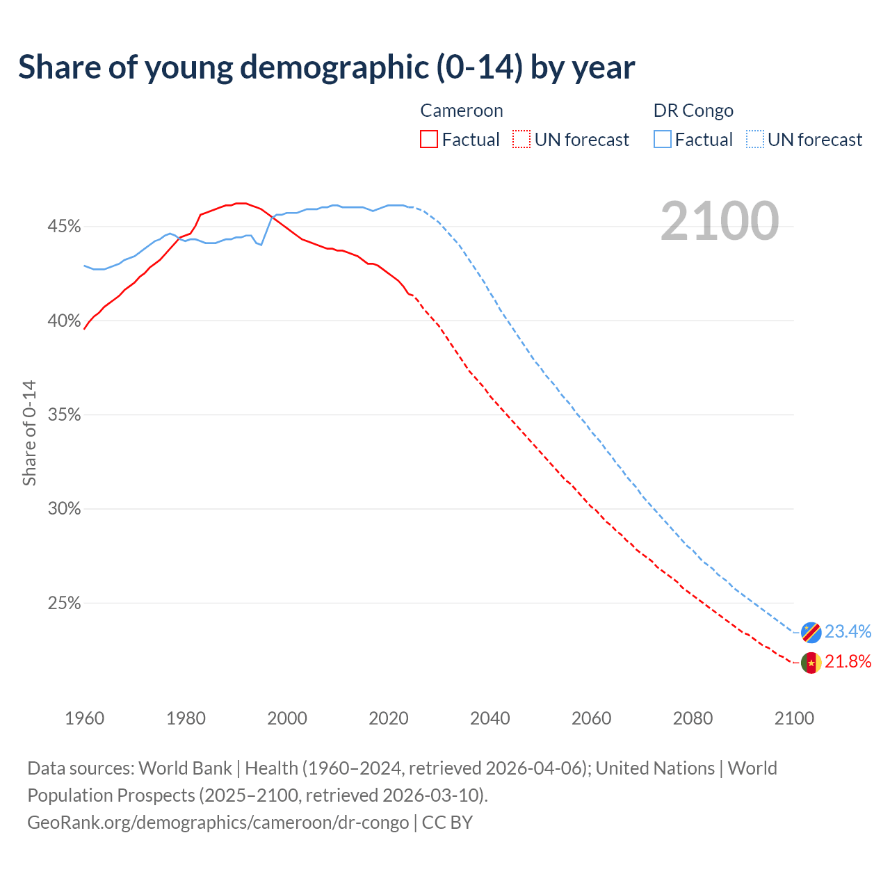 - The share of young demographic (0-15 years old) in Cameroon is 41.4% vs 46% in the DR Congo.