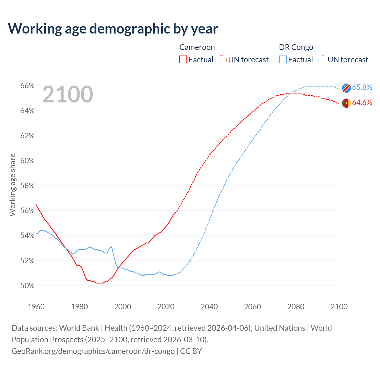 - Cameroon has 17.2M working age adults (aged 15-64) vs 59.8M in the DR Congo.