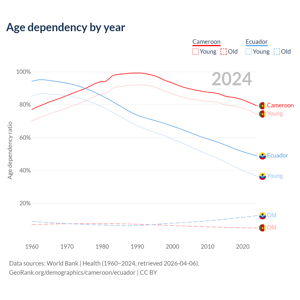 - The share of old-age demographic (65+) in Cameroon is 2.79% vs 8.34% in Ecuador.