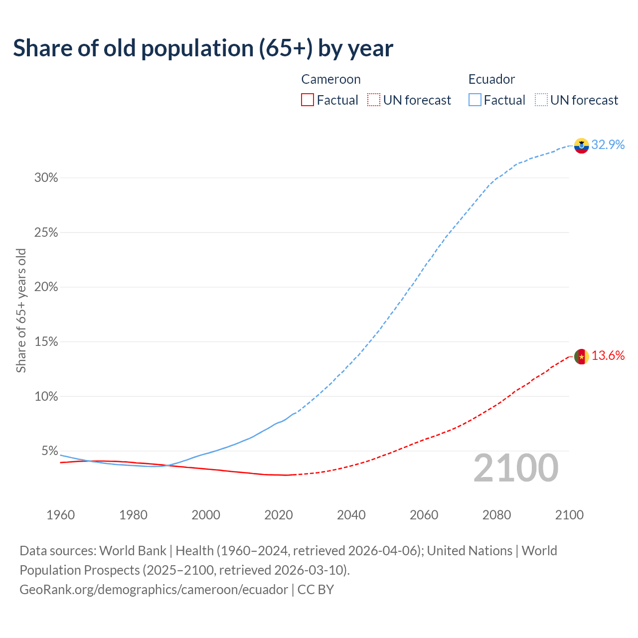 The share of older people aged 65 and over is 2.79% in Cameroon and 8.34% in Ecuador. Life expectancy in Cameroon compared to Ecuador .