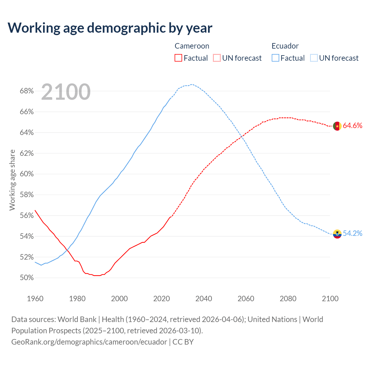 Median age Cameroon vs Ecuador, 1960-2100