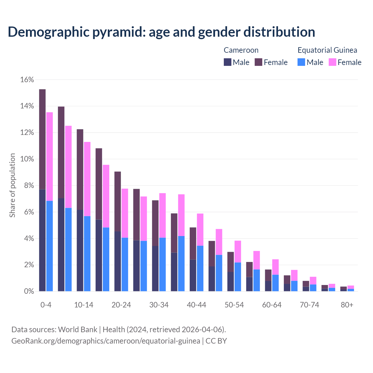 - As of 2026, the population of Cameroon is 30.9M vs 2M in Equatorial Guinea - 15.4 times difference.