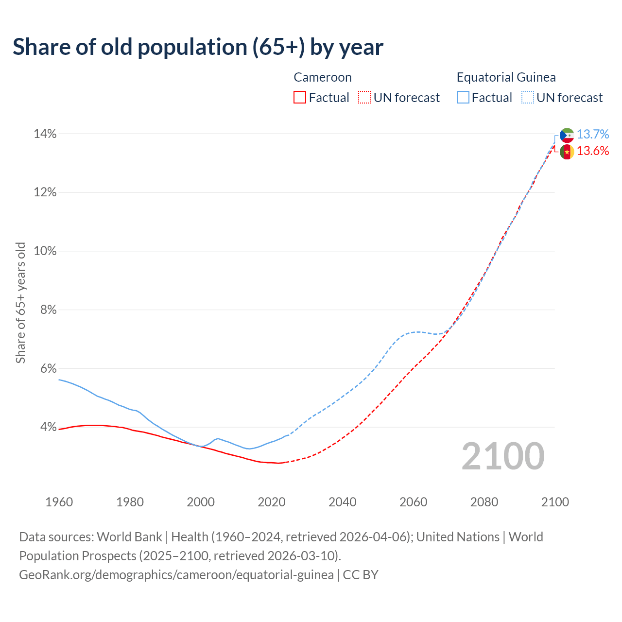 The share of older people aged 65 and over is 2.79% in Cameroon and 3.69% in Equatorial Guinea. Life expectancy in Cameroon compared to Equatorial Guinea .