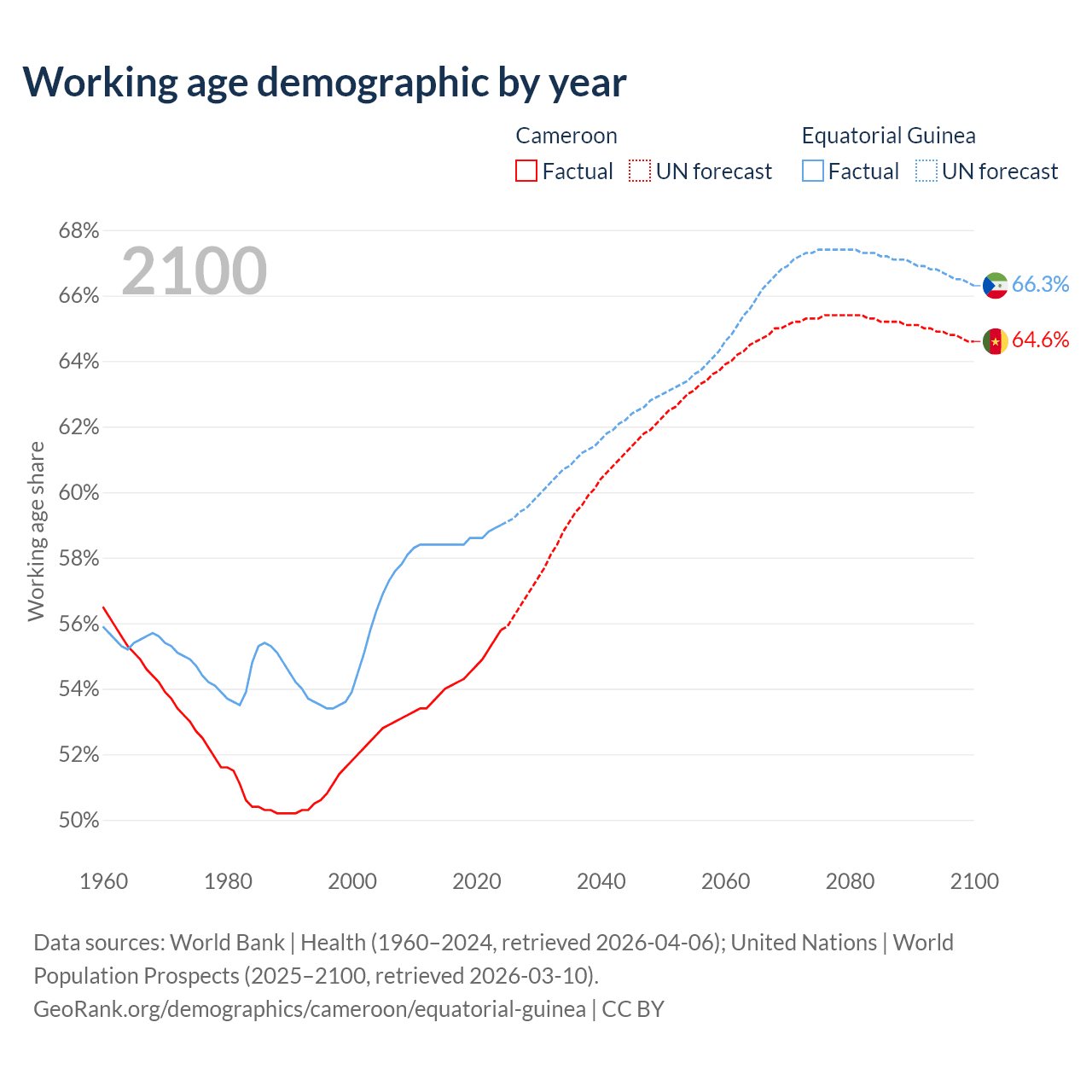 - Cameroon has 17.2M working age adults (aged 15-64) vs 1.18M in Equatorial Guinea.