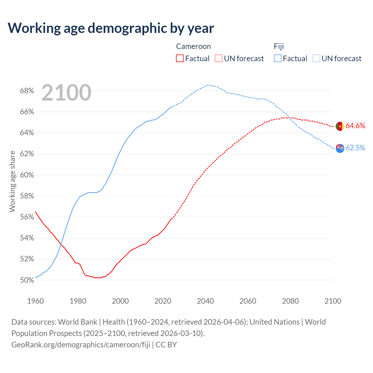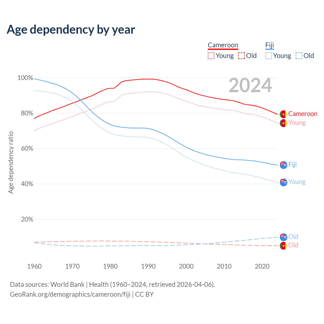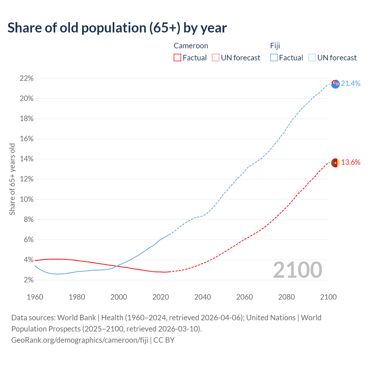 The share of older people aged 65 and over is 2.79% in Cameroon and 6.49% in Fiji. Life expectancy in Cameroon compared to Fiji .