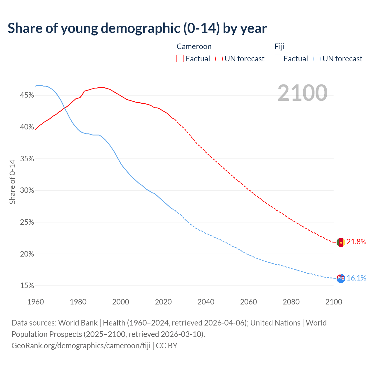 - The share of young demographic (0-15 years old) in Cameroon is 41.4% vs 27.1% in Fiji.