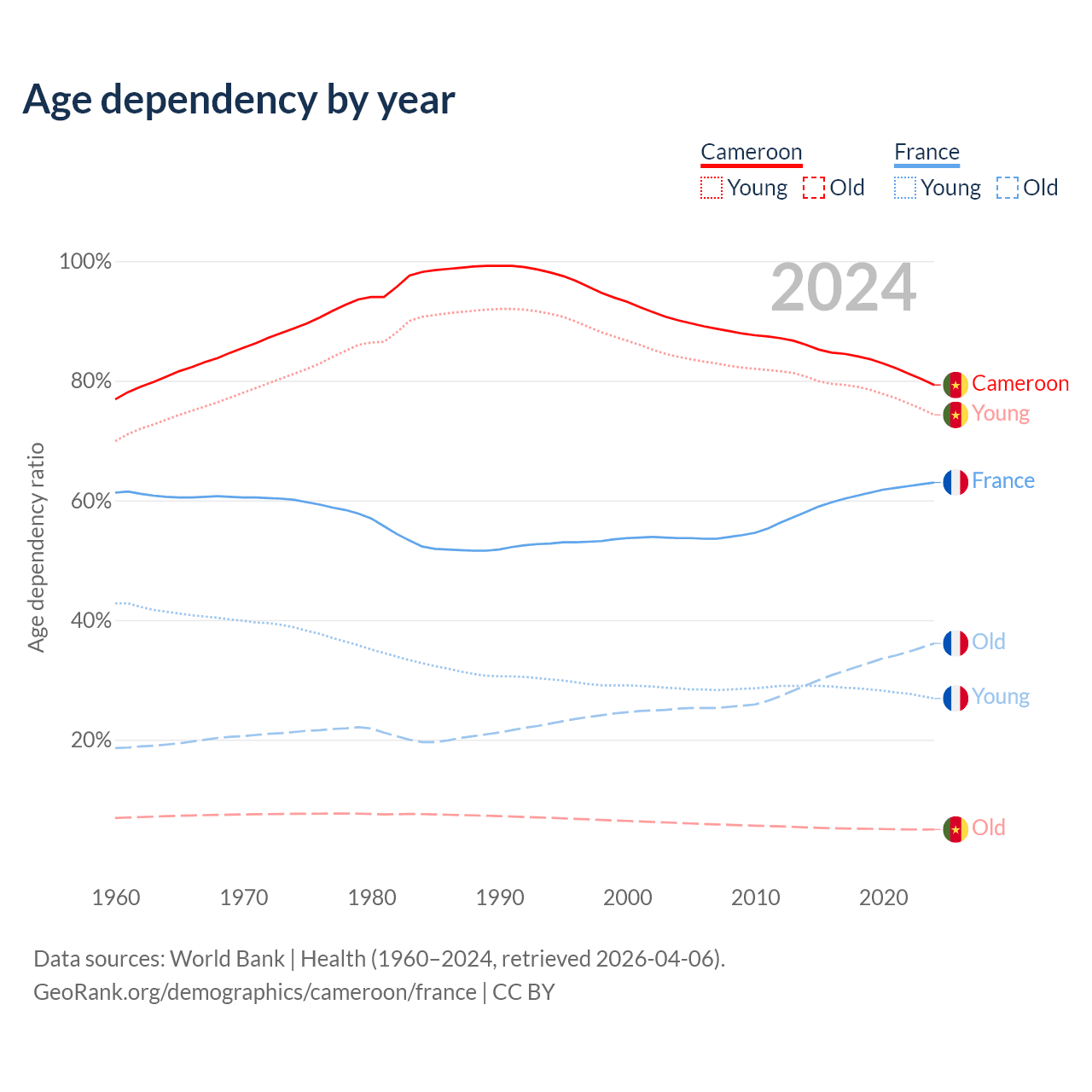 - Cameroon is ranked 180/196 by median age (oldest to youngest) vs 29/196 for France.
