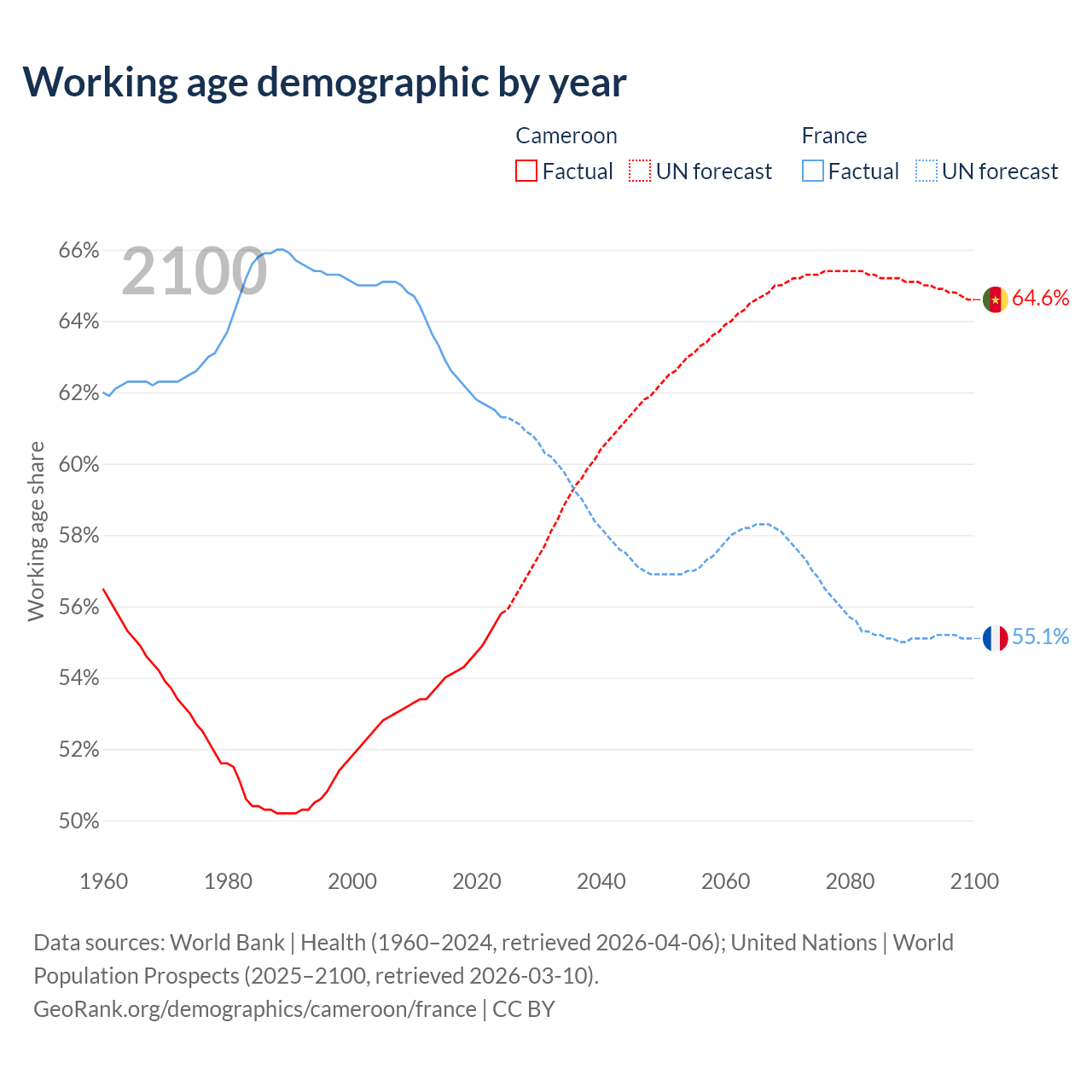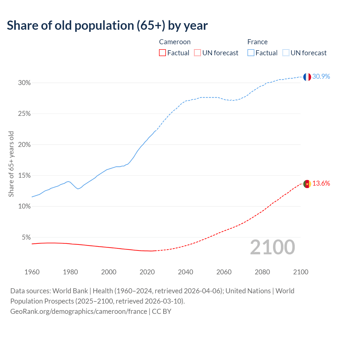 The share of older people aged 65 and over is 2.79% in Cameroon and 22.1% in France. Life expectancy in Cameroon compared to France .