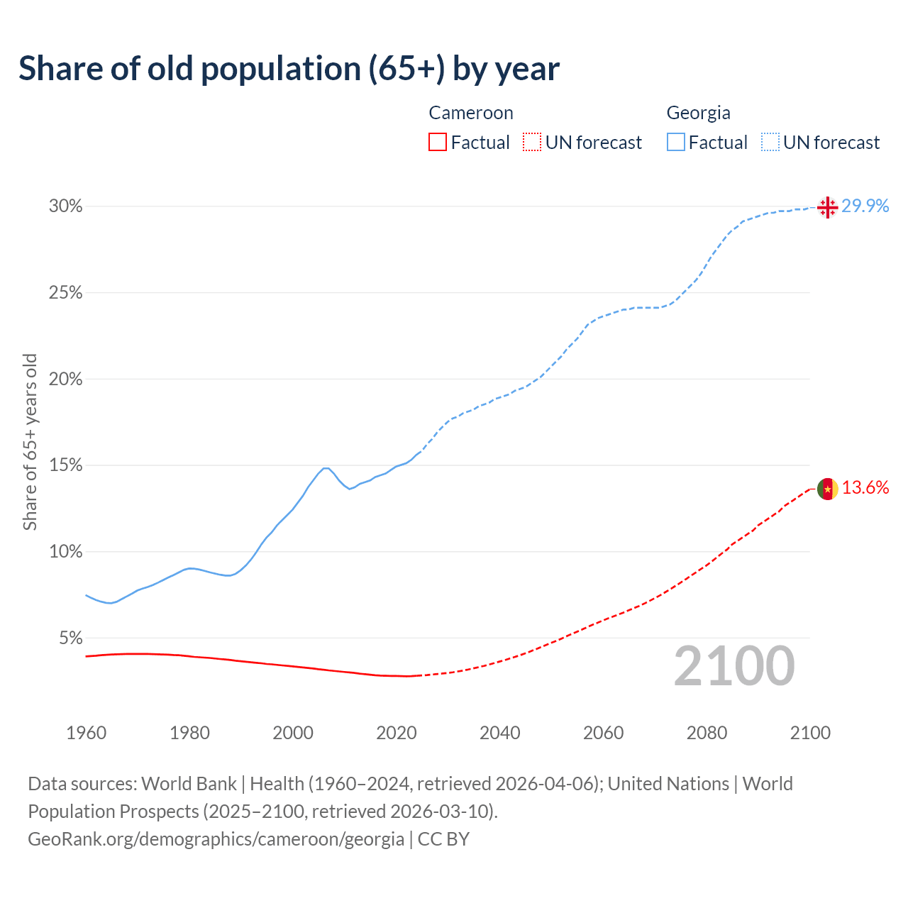 The share of older people aged 65 and over is 2.79% in Cameroon and 15.6% in Georgia. Life expectancy in Cameroon compared to Georgia .