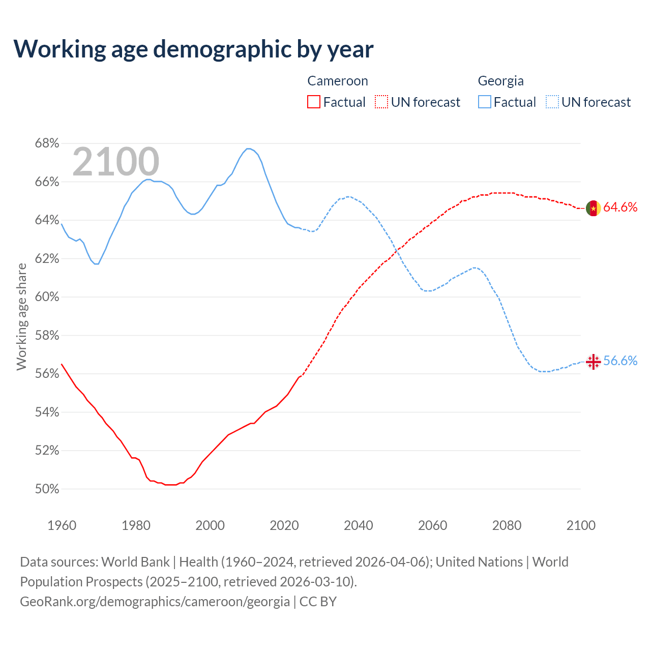 - Cameroon has 17.2M working age adults (aged 15-64) vs 2.35M in Georgia.