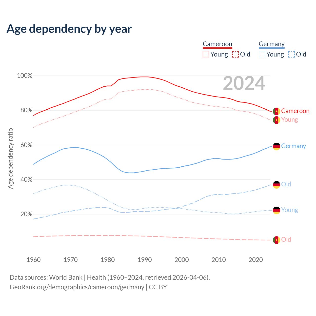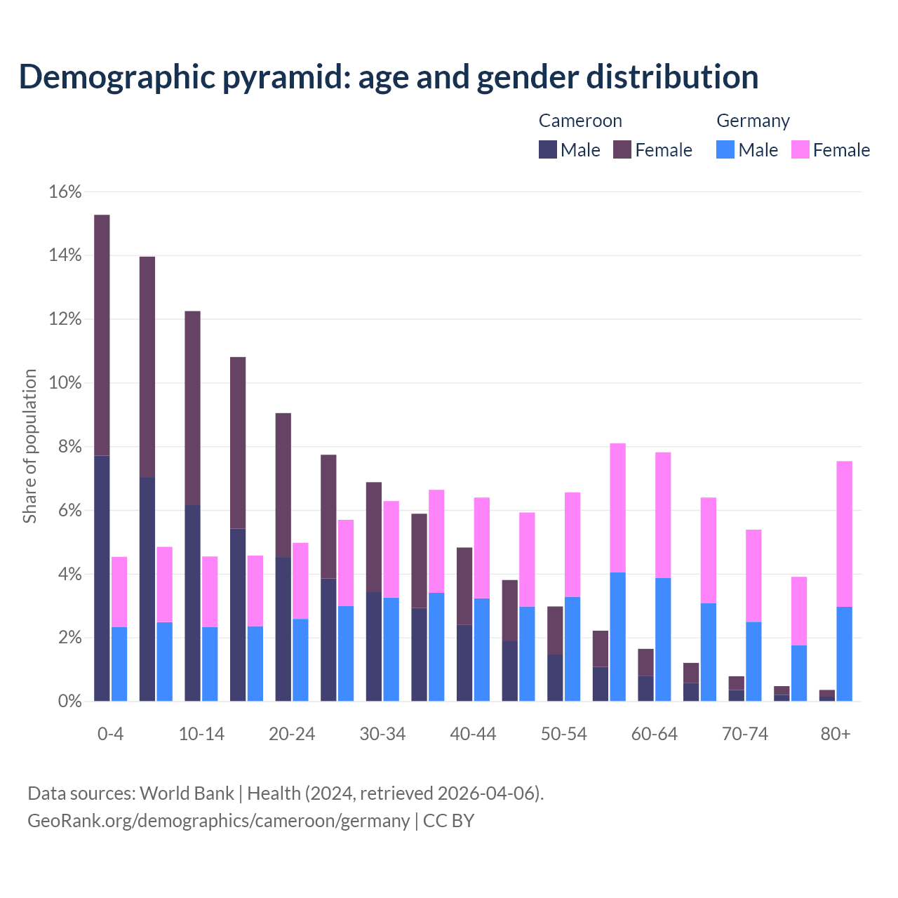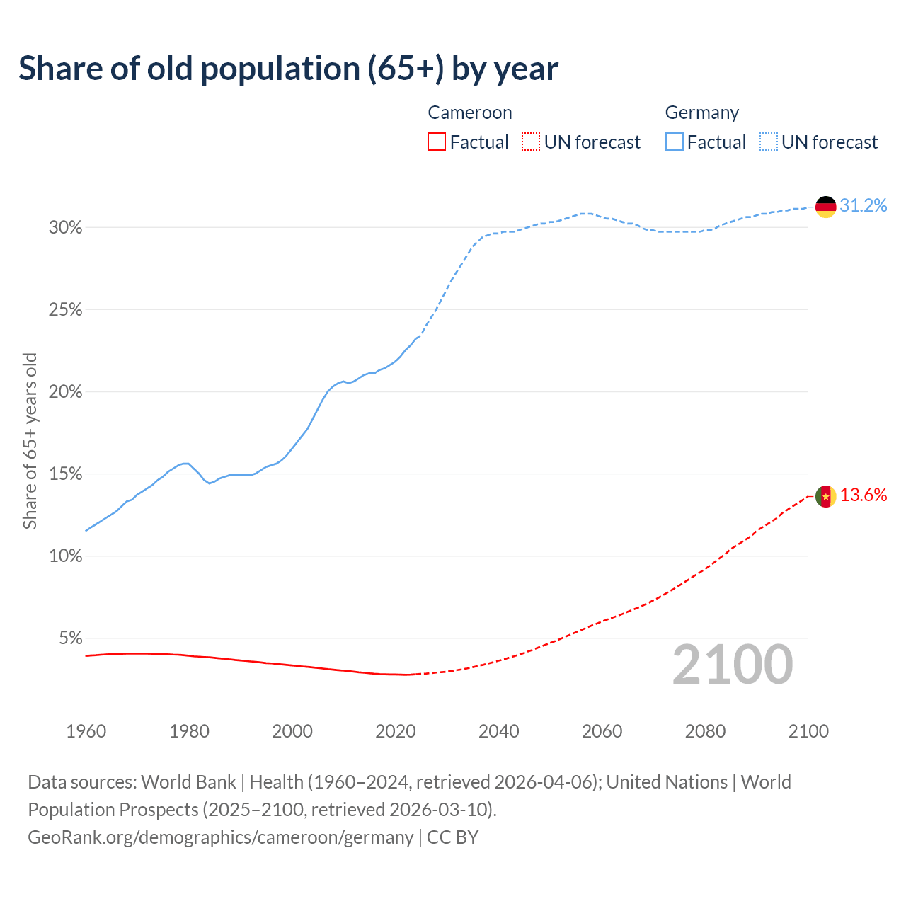 The share of older people aged 65 and over is 2.79% in Cameroon and 23.2% in Germany. Life expectancy in Cameroon compared to Germany .