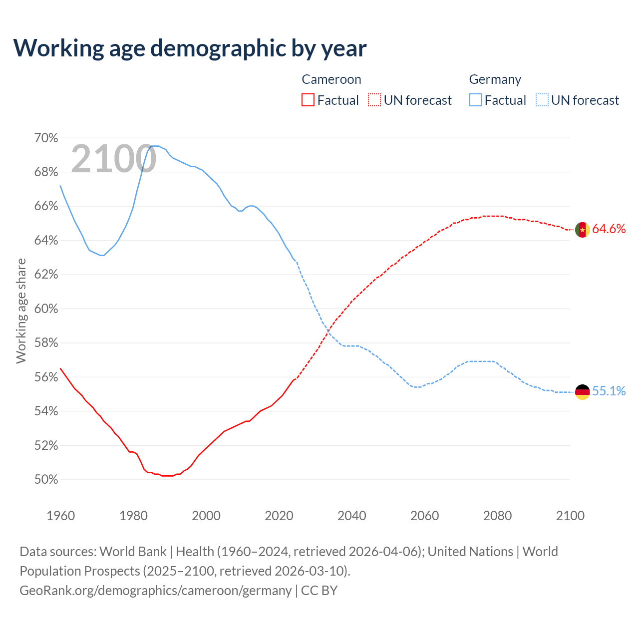 - Cameroon has 17.2M working age adults (aged 15-64) vs 51.9M in Germany.