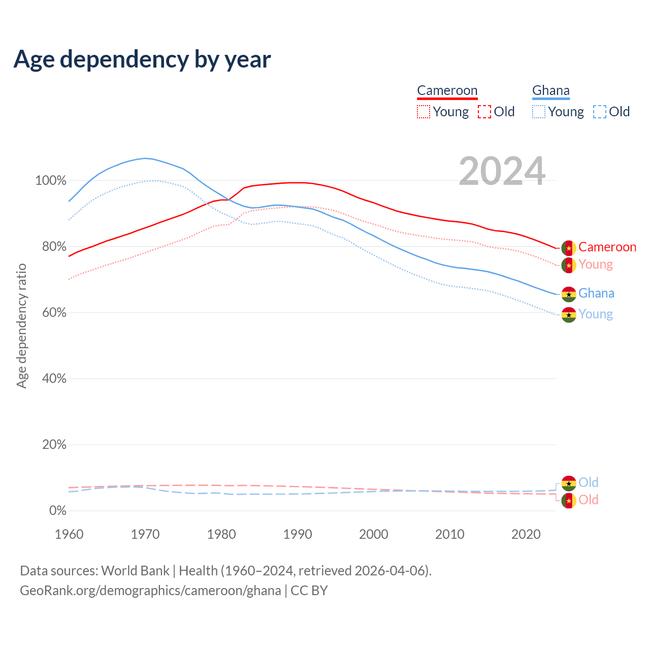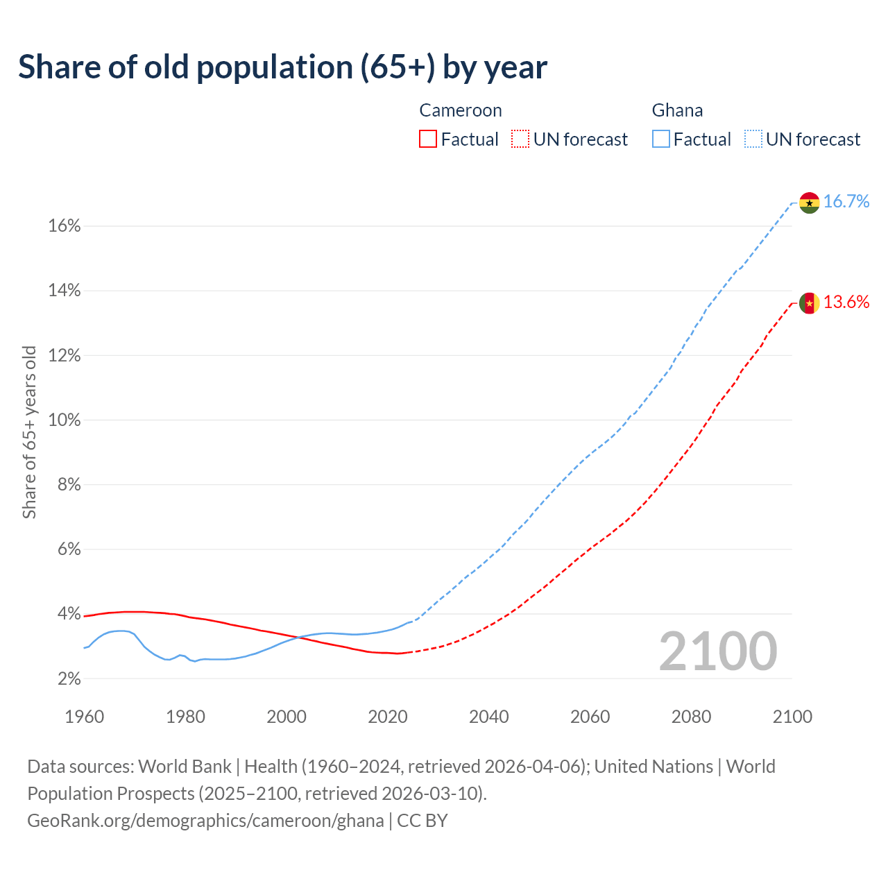 The share of older people aged 65 and over is 2.79% in Cameroon and 3.71% in Ghana. Life expectancy in Cameroon compared to Ghana .