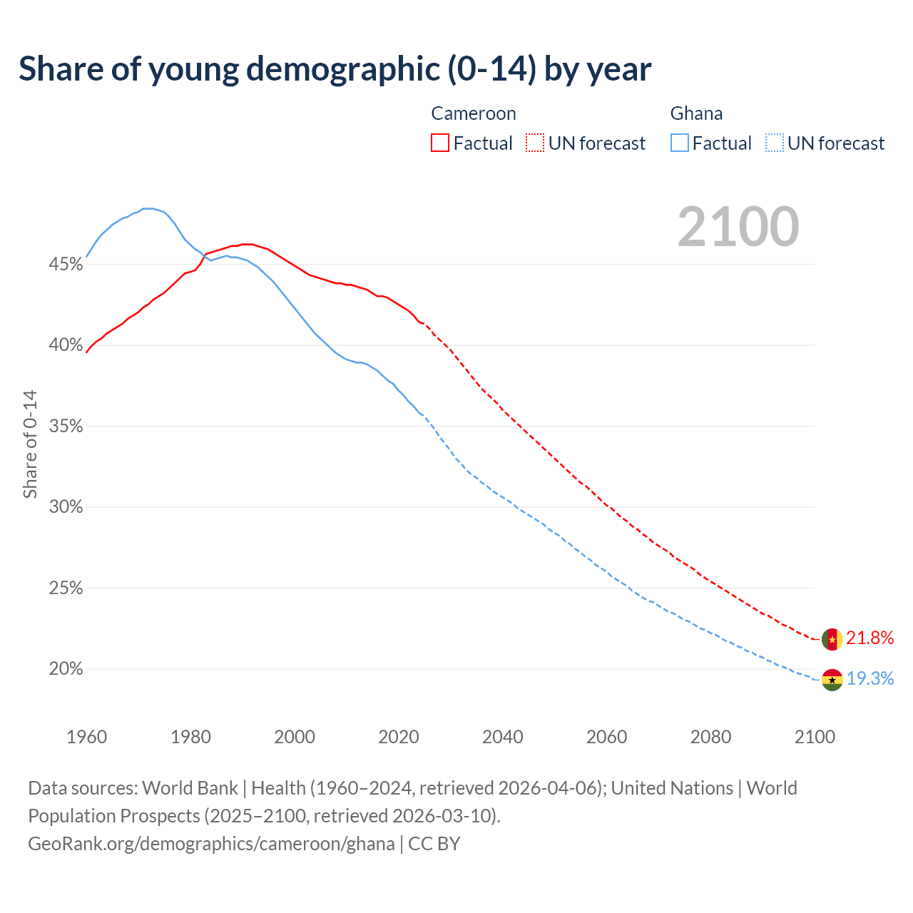 - The share of young demographic (0-15 years old) in Cameroon is 41.4% vs 35.8% in Ghana.