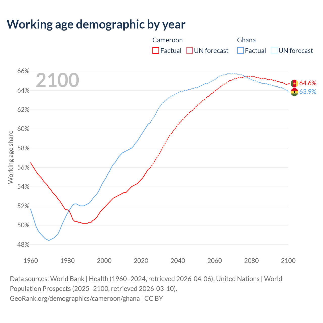 - Cameroon has 17.2M working age adults (aged 15-64) vs 21.7M in Ghana.