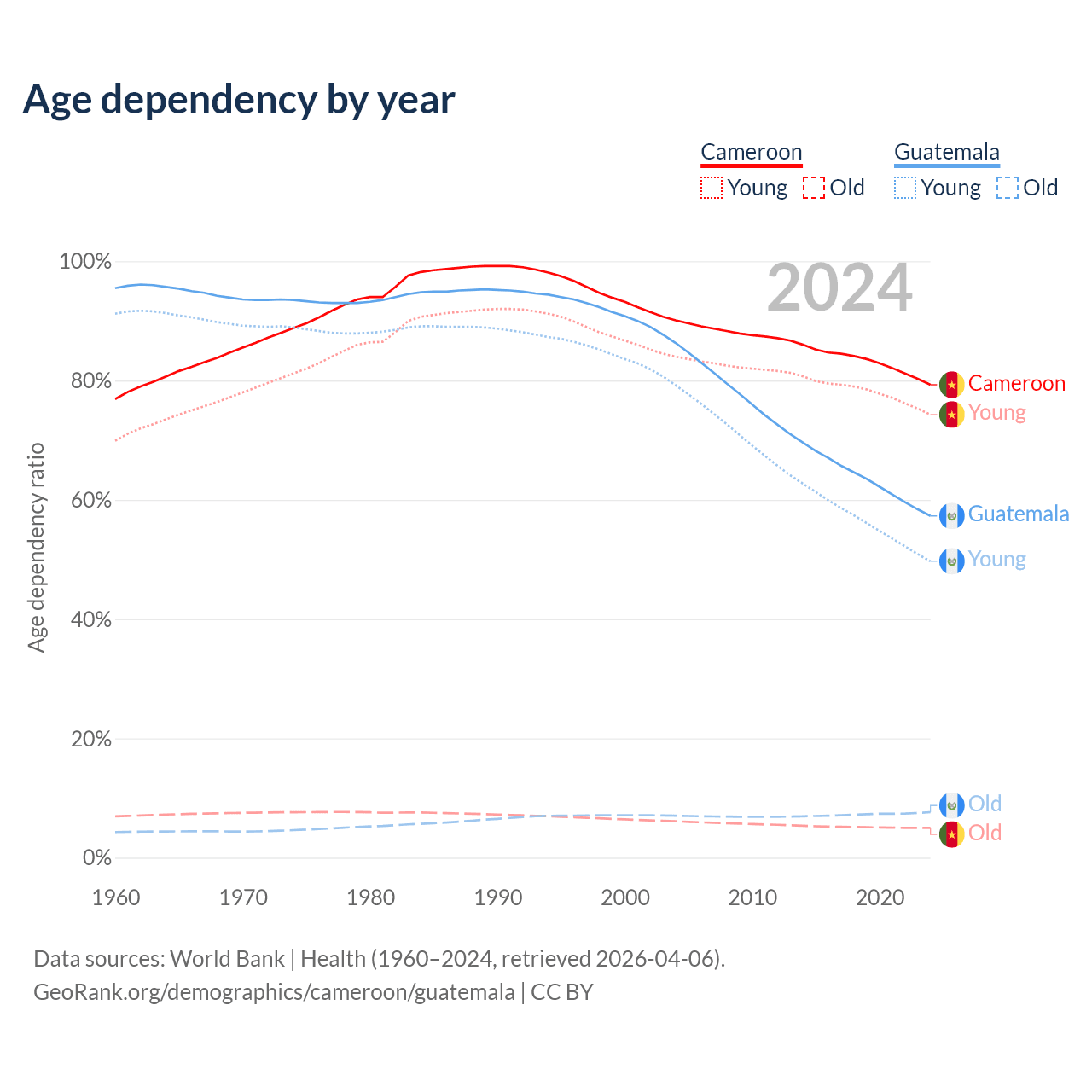 Data sources: World Bank | Health (1960–2024, retrieved 2026-04-06); U.S. Census Bureau (1960–2024, retrieved 2026-02-08).