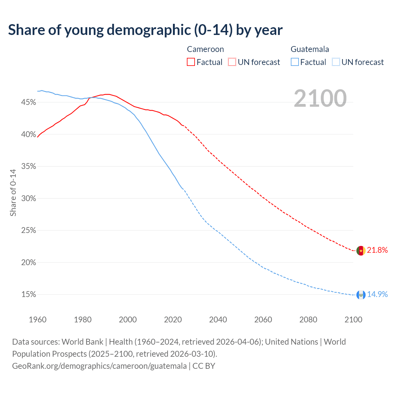 - The share of young demographic (0-15 years old) in Cameroon is 41.4% vs 31.6% in Guatemala.