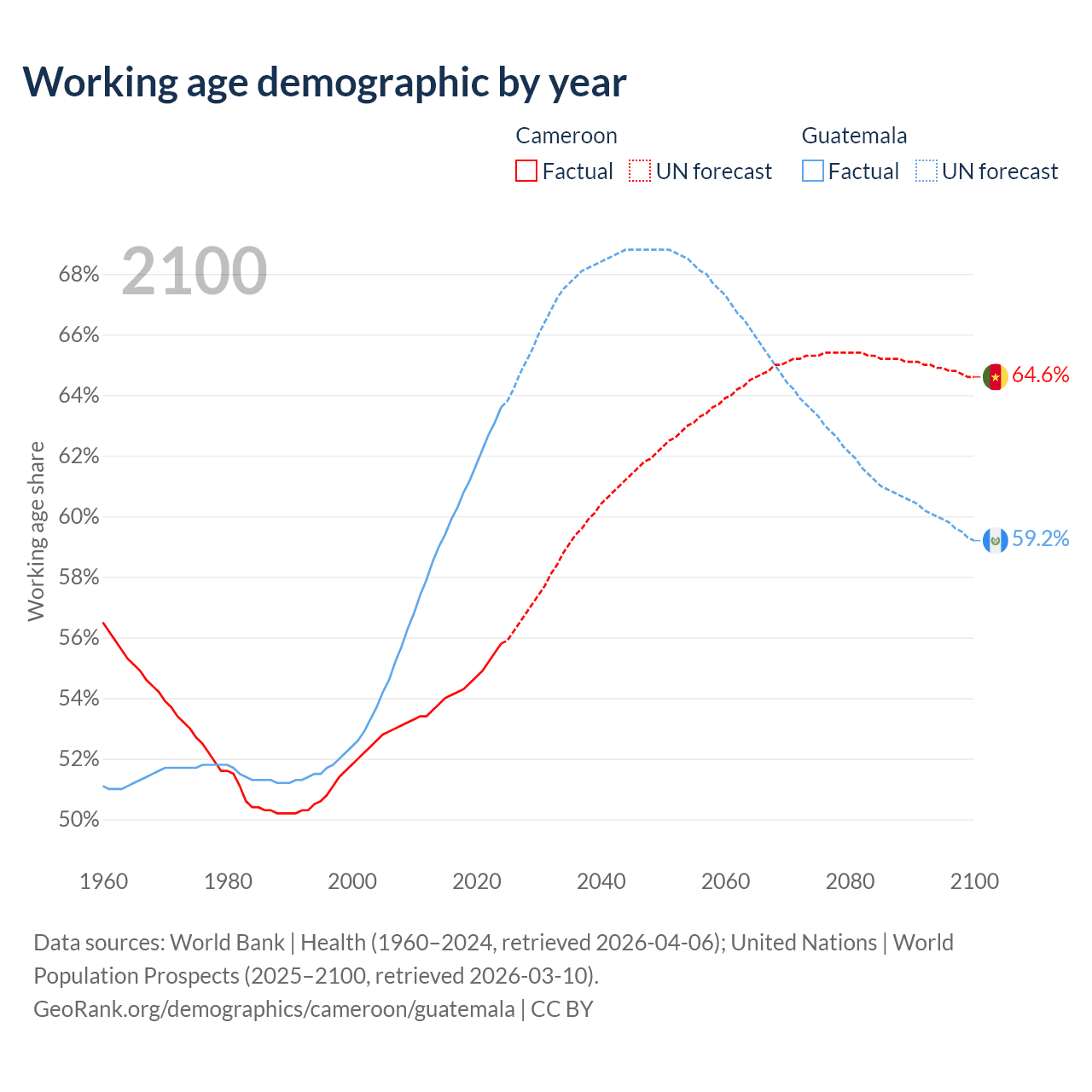 - Cameroon has 17.2M working age adults (aged 15-64) vs 12.1M in Guatemala.