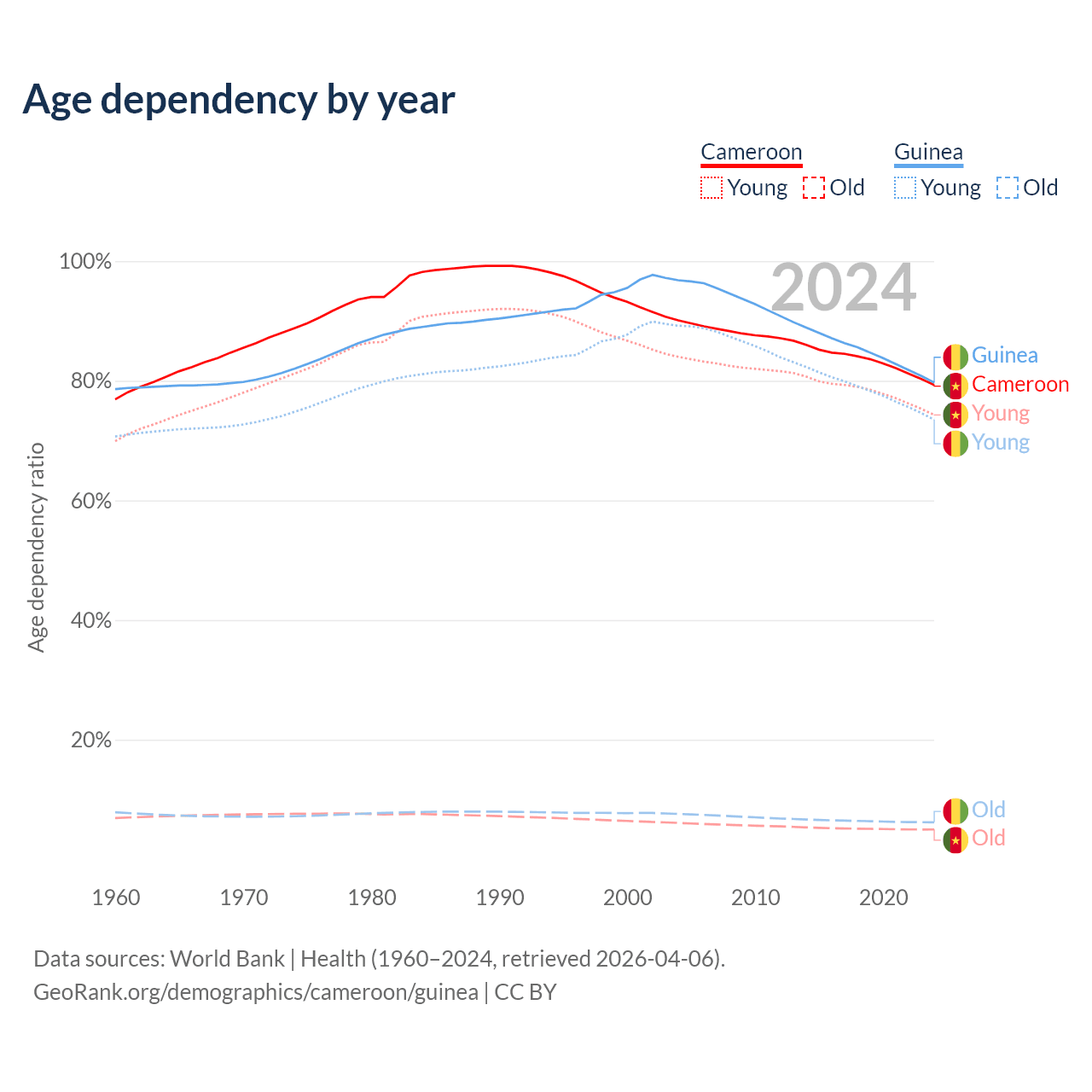 - Cameroon is ranked 180/196 by median age (oldest to youngest) vs 176/196 for Guinea.
