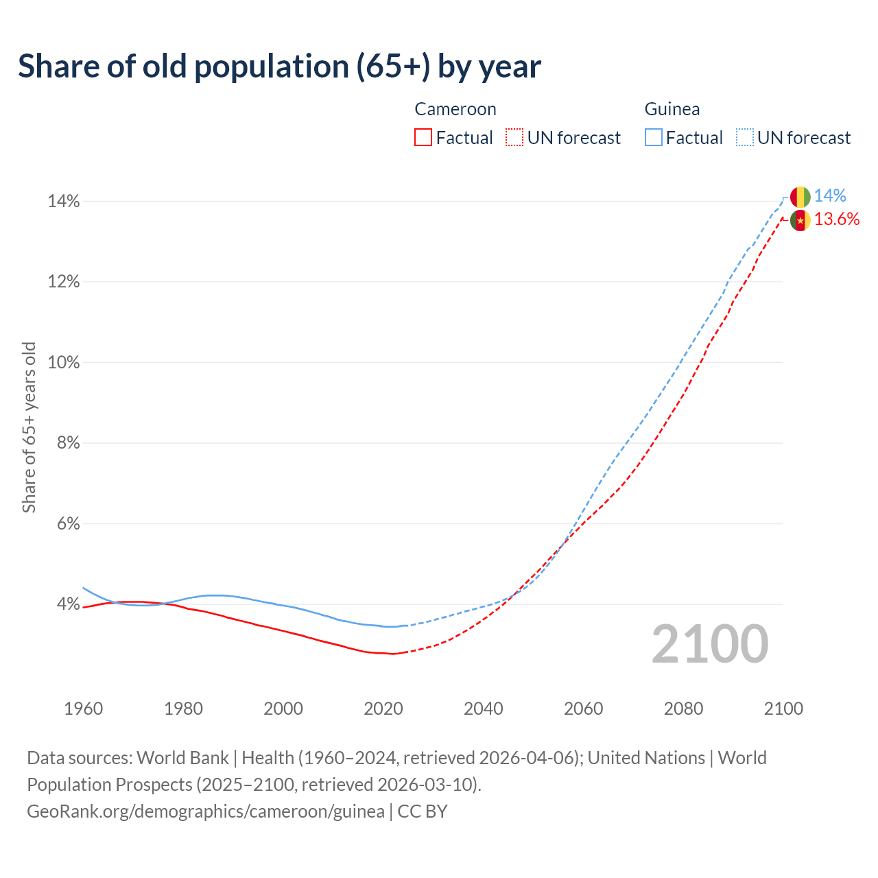 The share of older people aged 65 and over is 2.79% in Cameroon and 3.46% in Guinea. Life expectancy in Cameroon compared to Guinea .