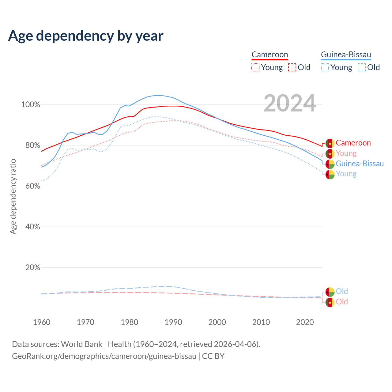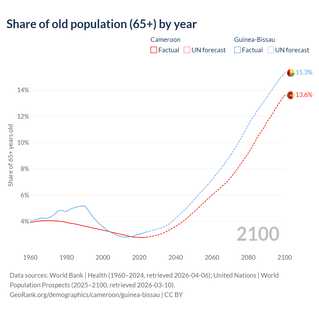 - The share of old-age demographic (65+) in Cameroon is 2.79% vs 3.19% in Guinea-Bissau.