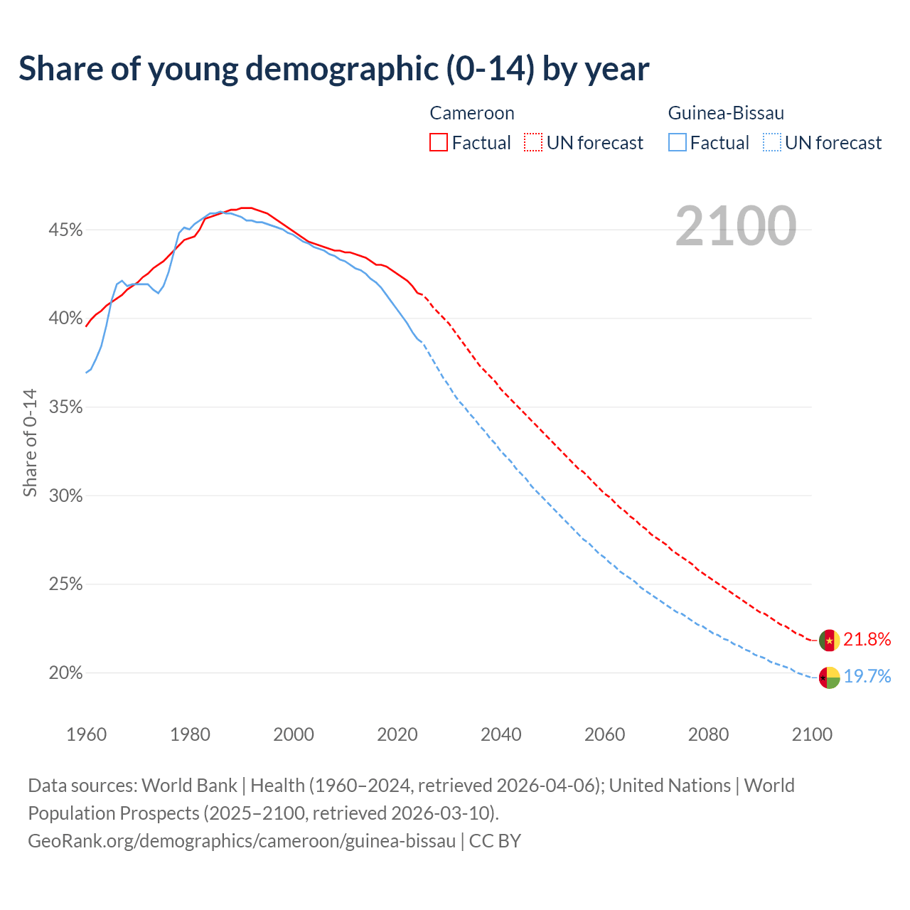 Median age Cameroon vs Guinea-Bissau, 1960-2100