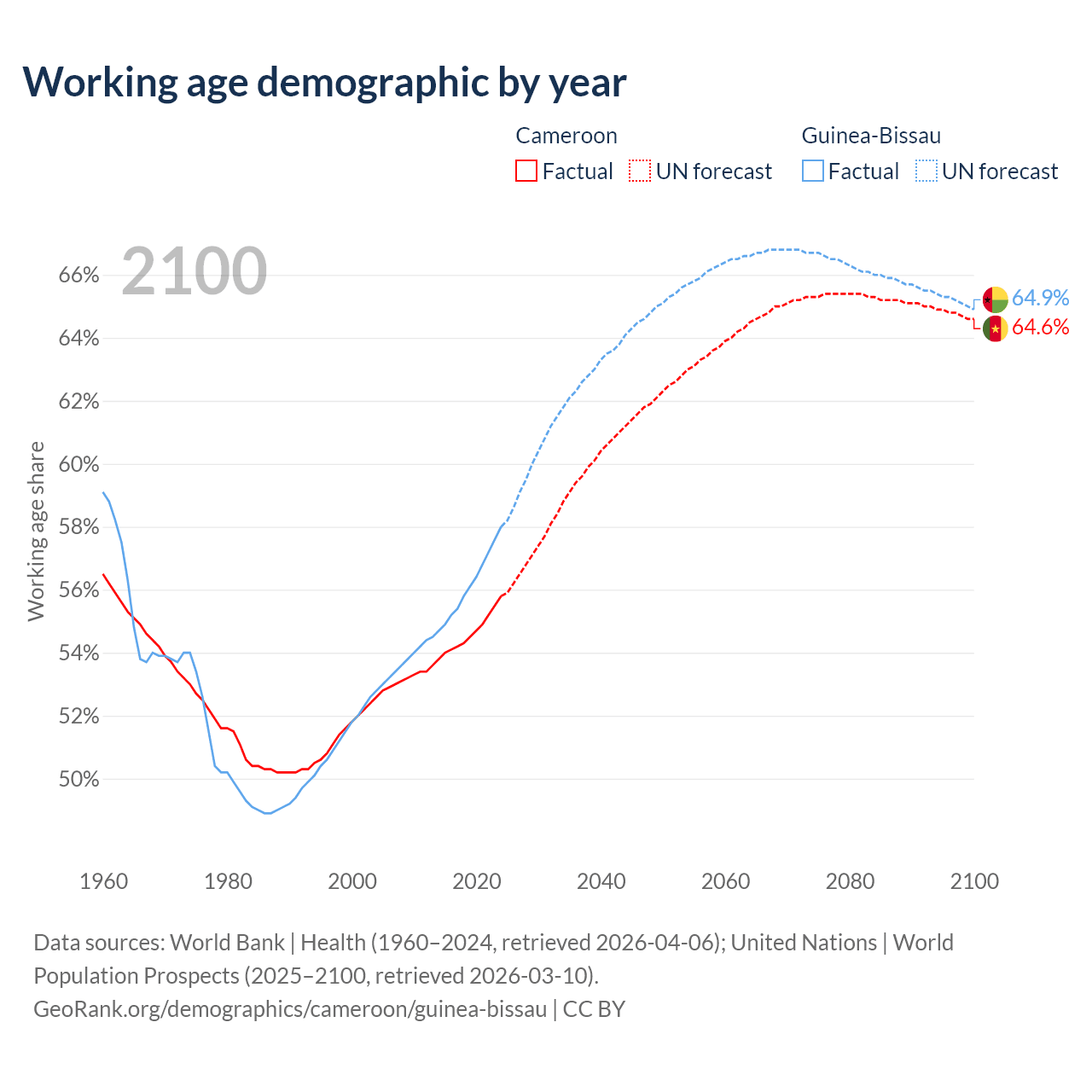- Cameroon has 17.2M working age adults (aged 15-64) vs 1.34M in Guinea-Bissau.