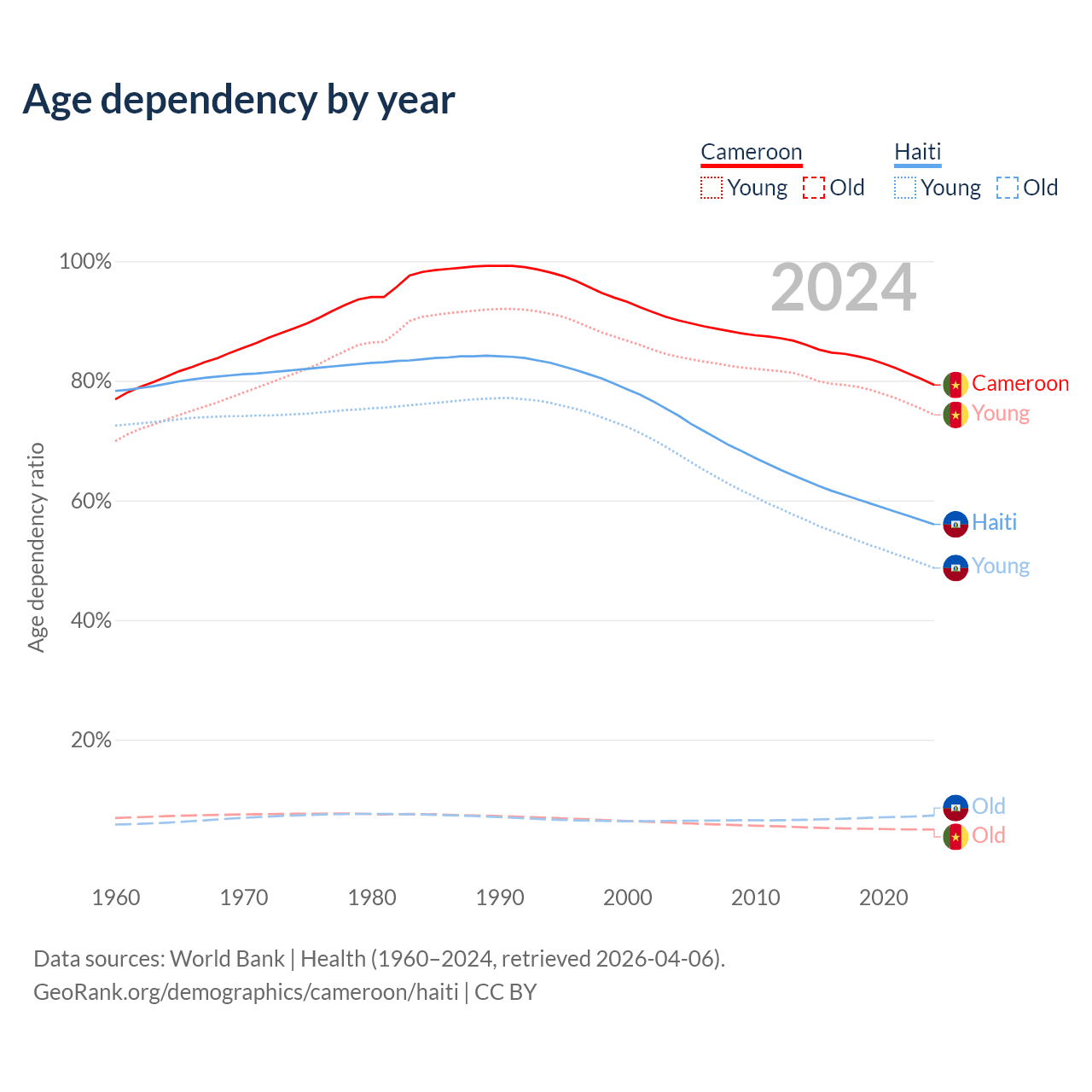 - Cameroon is ranked 180/196 by median age (oldest to youngest) vs 135/196 for Haiti.