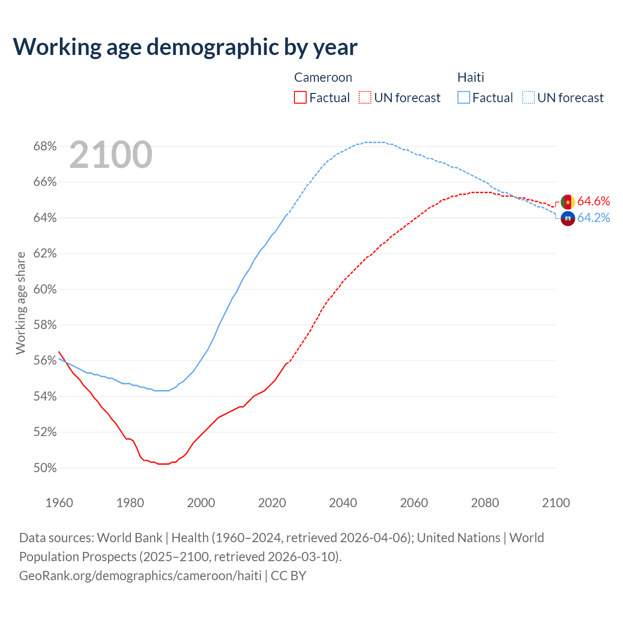 - Cameroon has 17.2M working age adults (aged 15-64) vs 7.74M in Haiti.