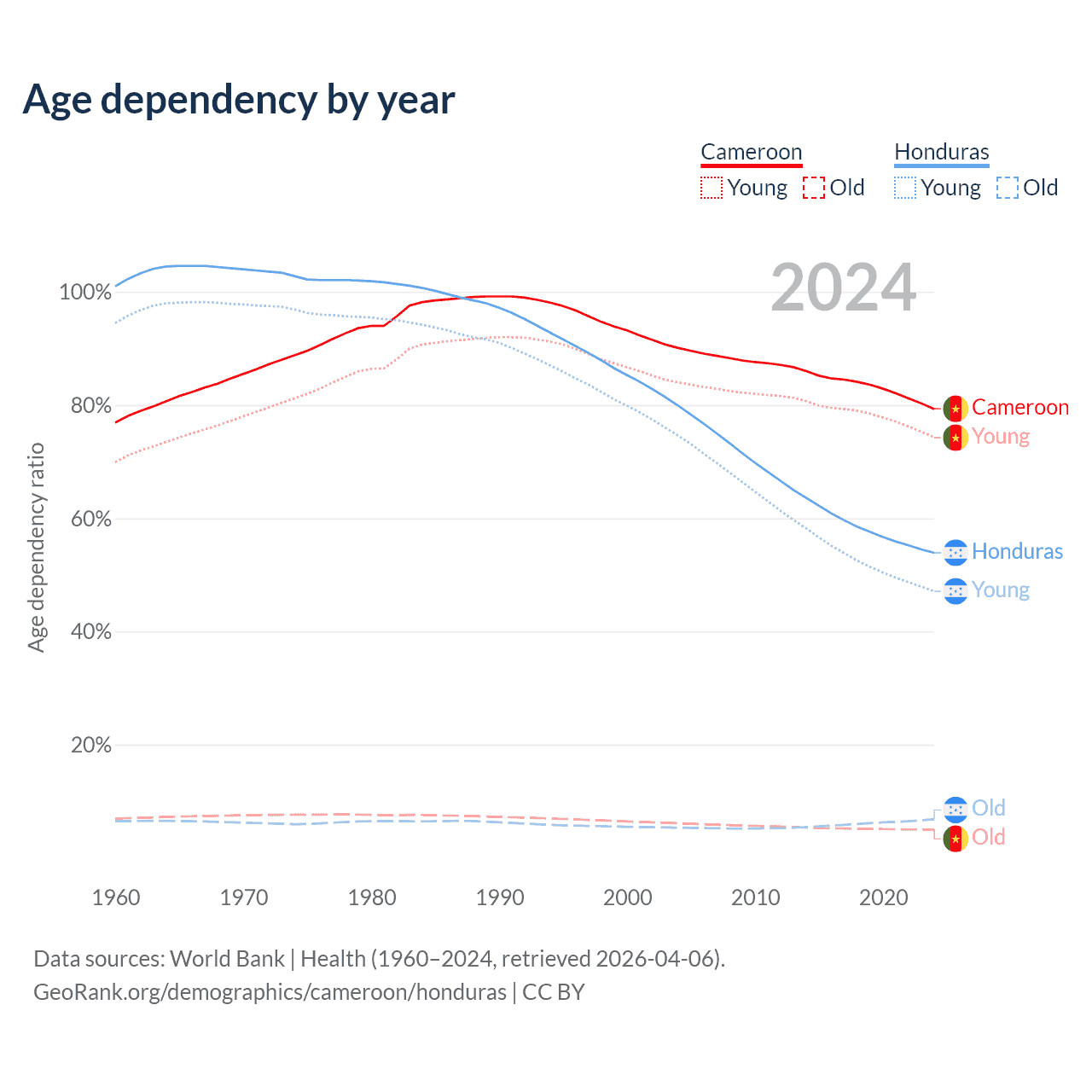 - Cameroon is ranked 180/196 by median age (oldest to youngest) vs 134/196 for Honduras.