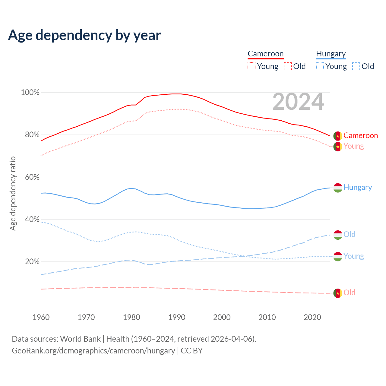 The share of older people aged 65 and over is 2.79% in Cameroon and 21% in Hungary. Life expectancy in Cameroon compared to Hungary .