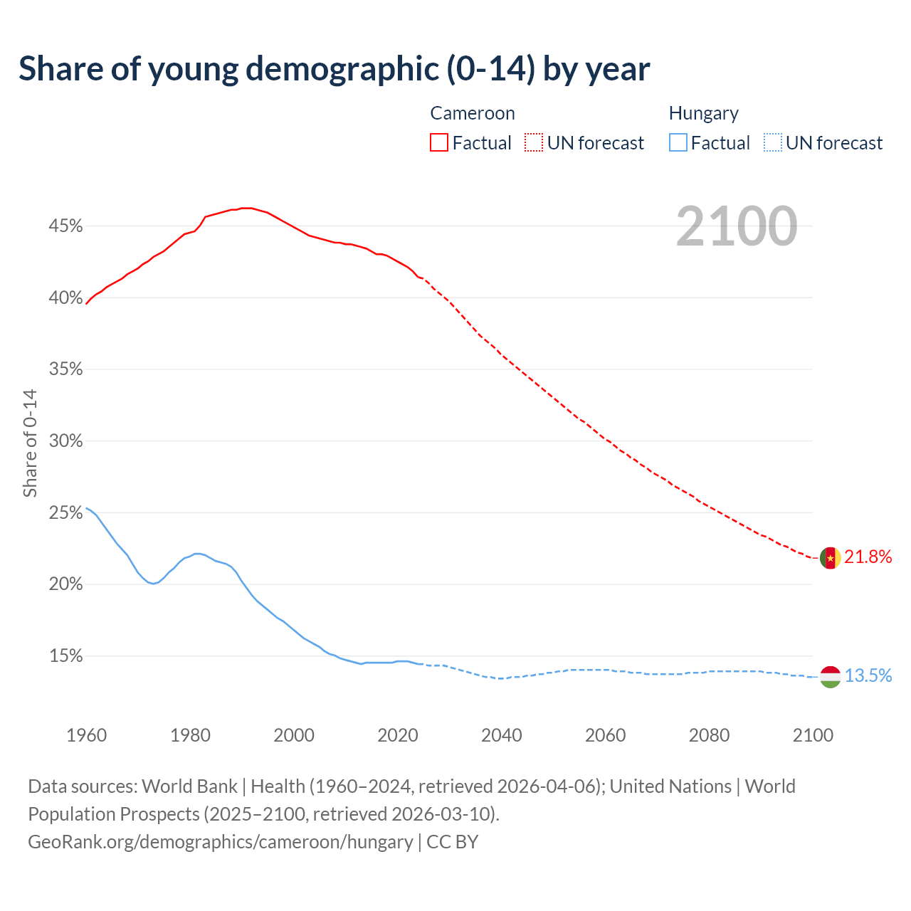 - The share of young demographic (0-15 years old) in Cameroon is 41.4% vs 14.4% in Hungary.