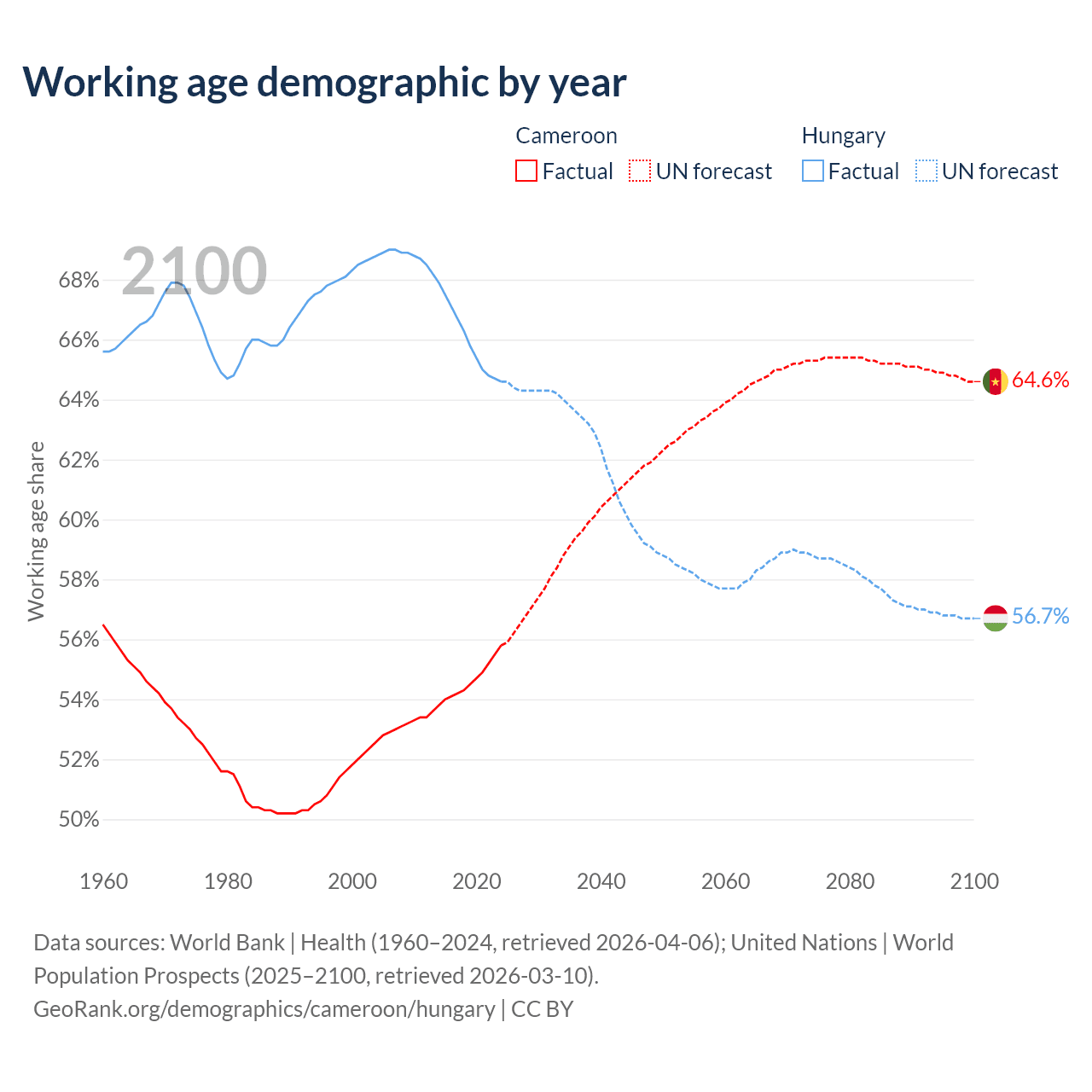 - Cameroon has 17.2M working age adults (aged 15-64) vs 6.12M in Hungary.