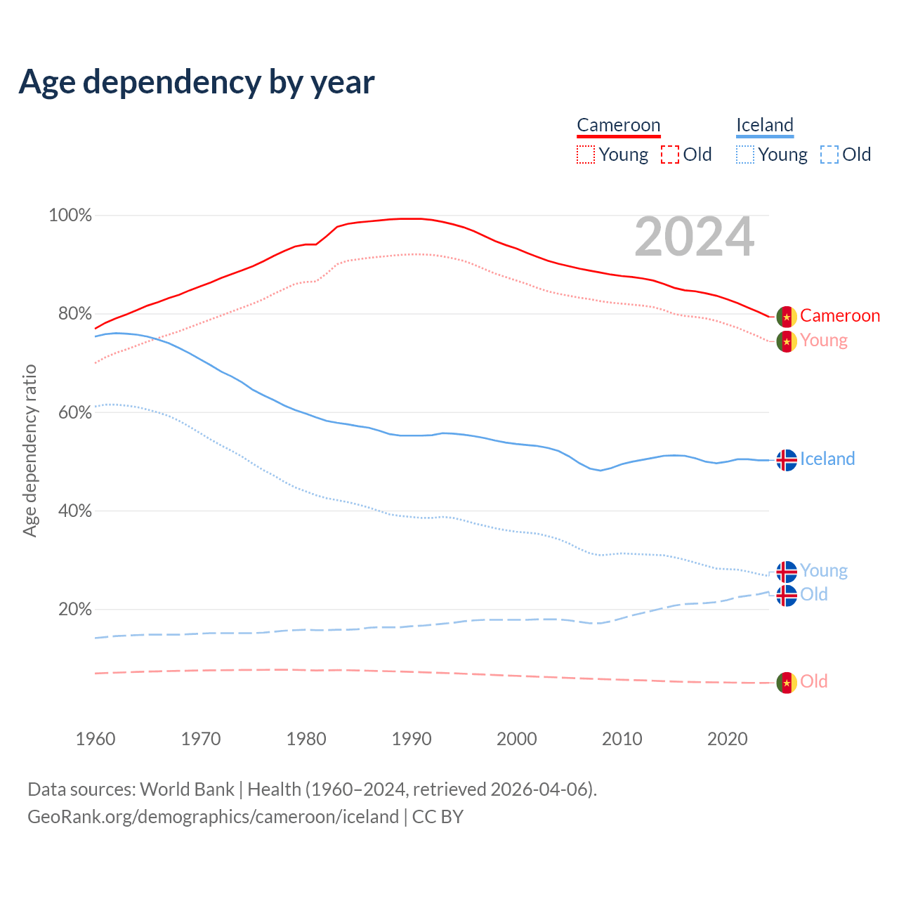 - The share of old-age demographic (65+) in Cameroon is 2.79% vs 15.6% in Iceland.