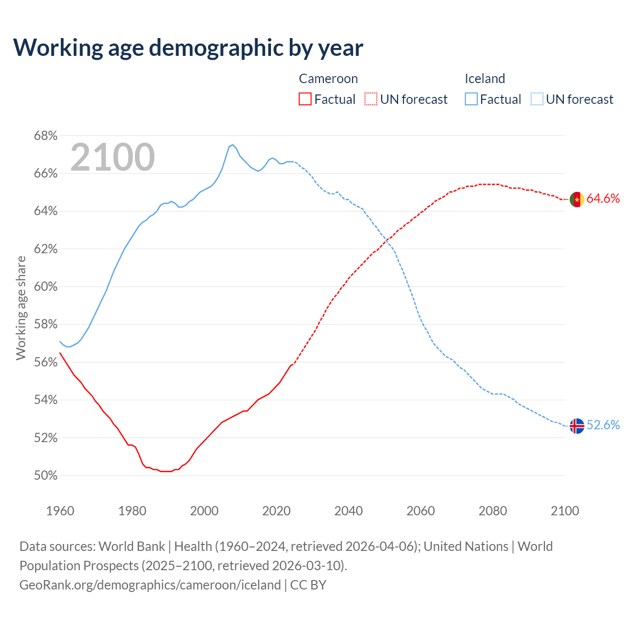 - Cameroon has 17.2M working age adults (aged 15-64) vs 264K in Iceland.