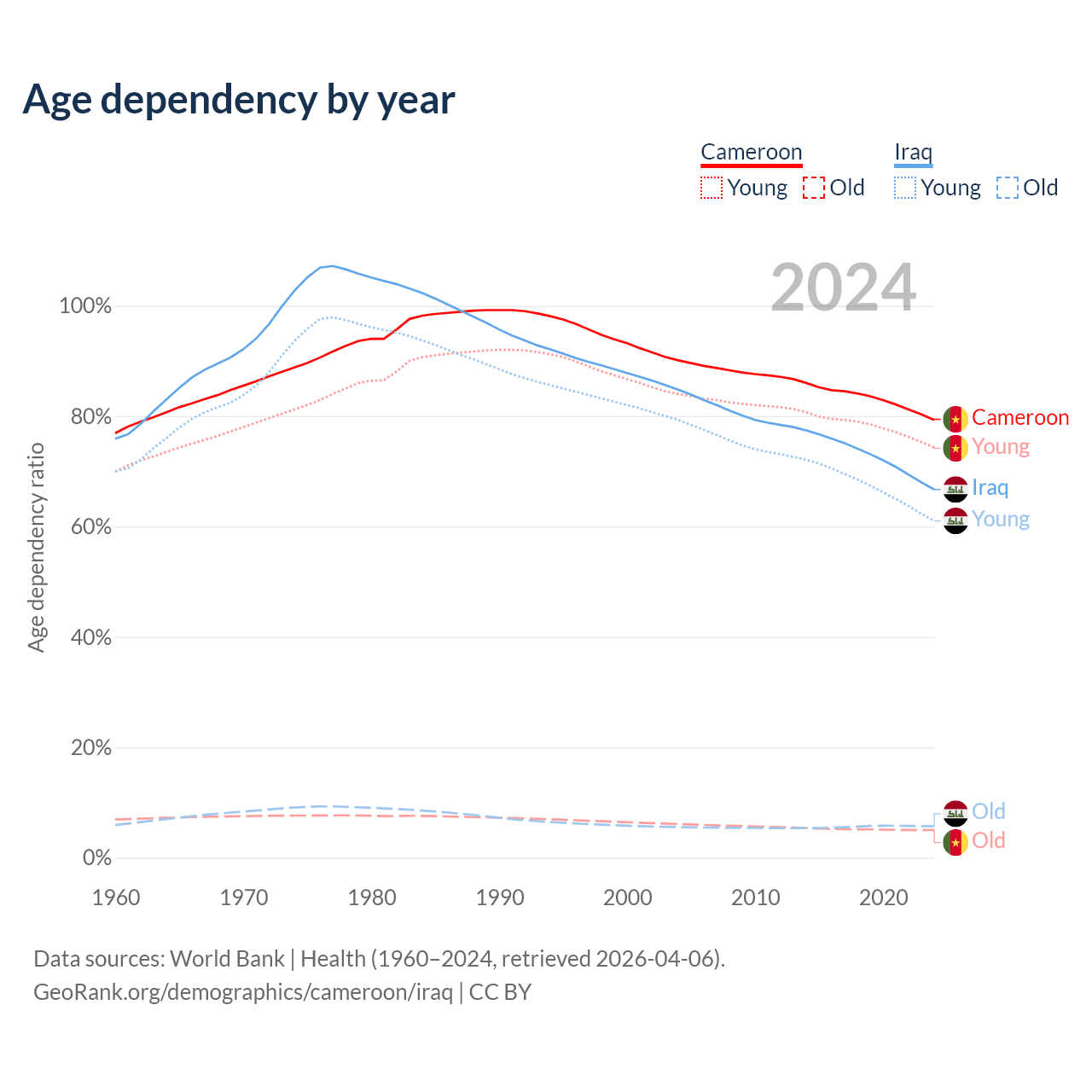- Cameroon is ranked 180/196 by median age (oldest to youngest) vs 151/196 for Iraq.