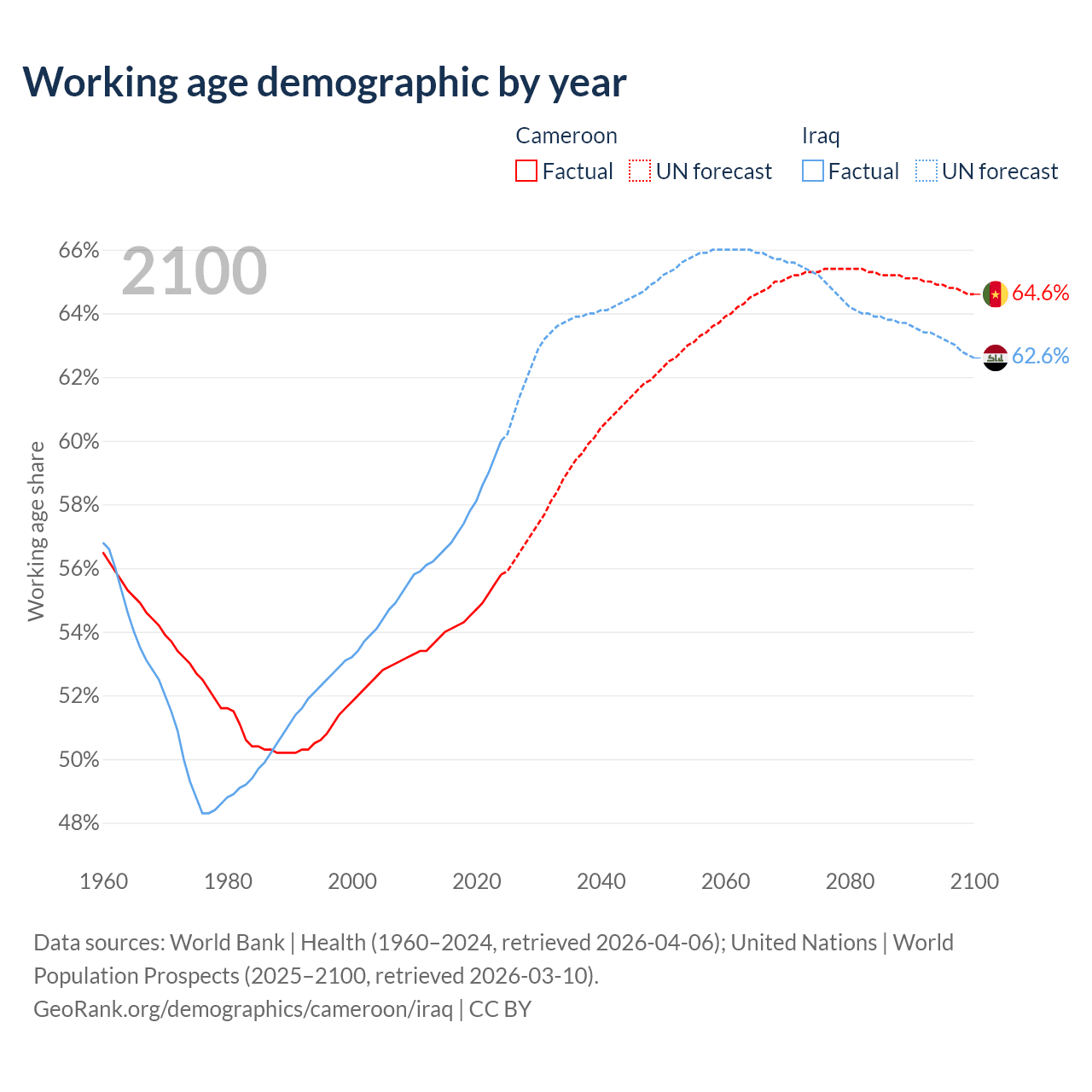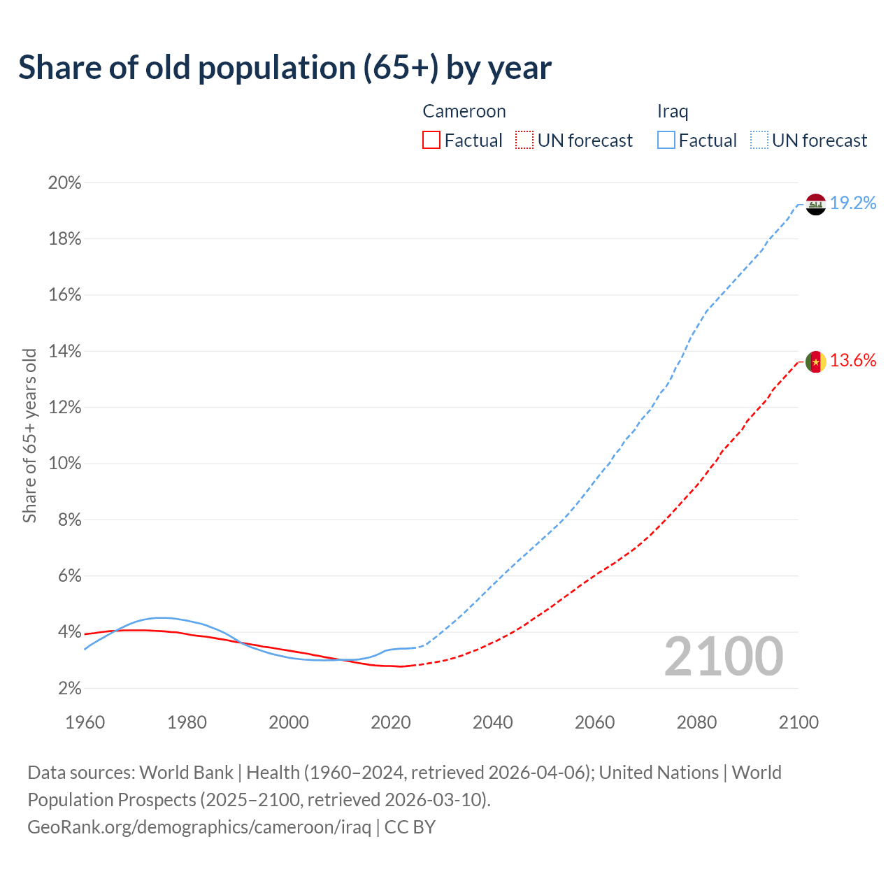 The share of older people aged 65 and over is 2.79% in Cameroon and 3.41% in Iraq. Life expectancy in Cameroon compared to Iraq .
