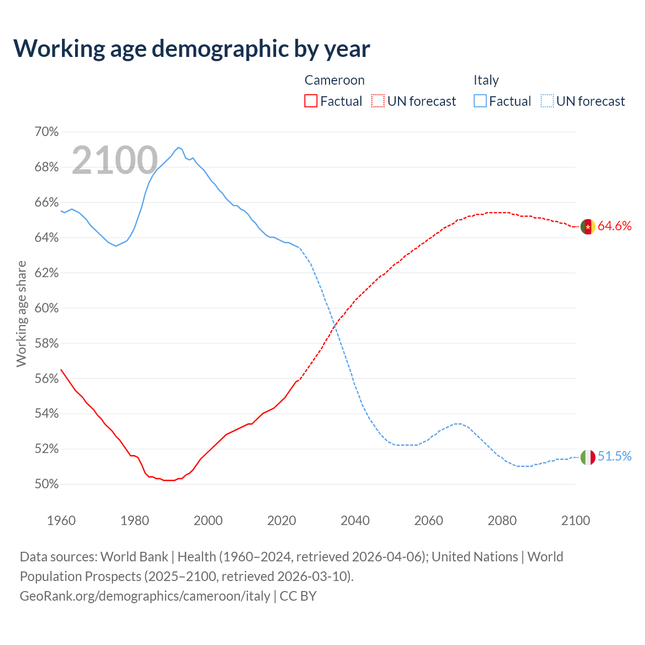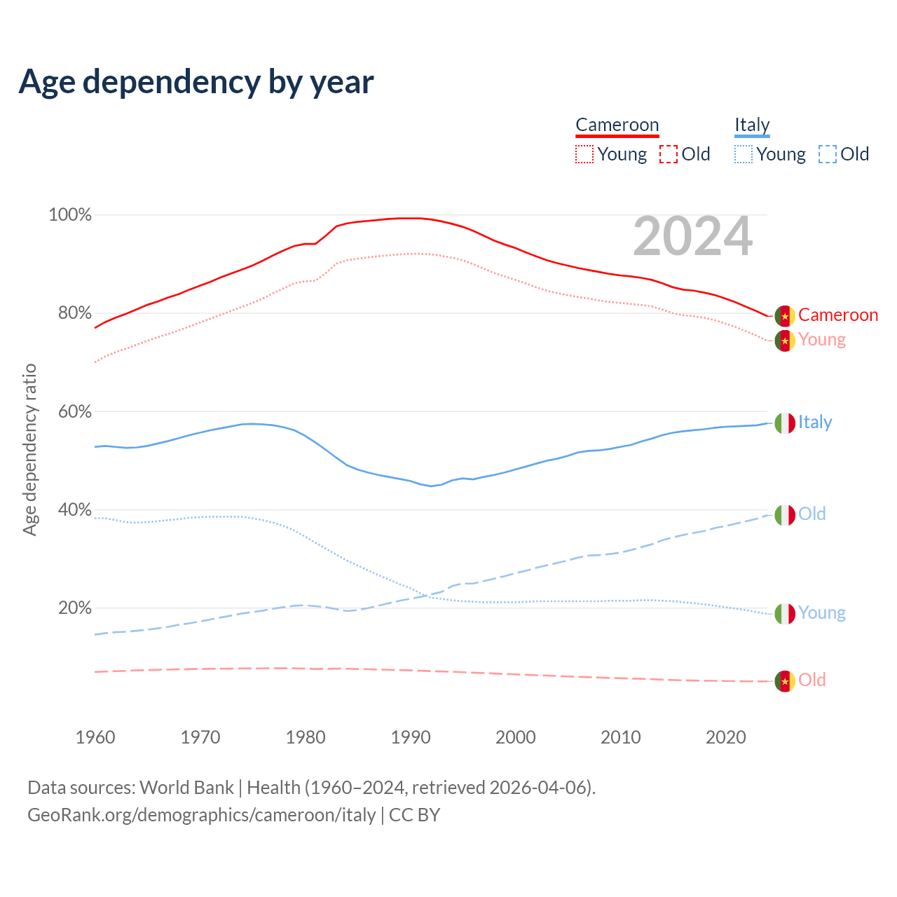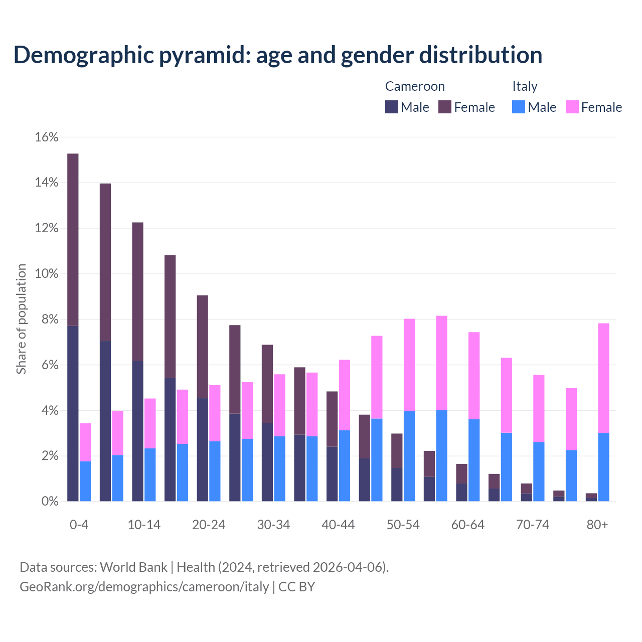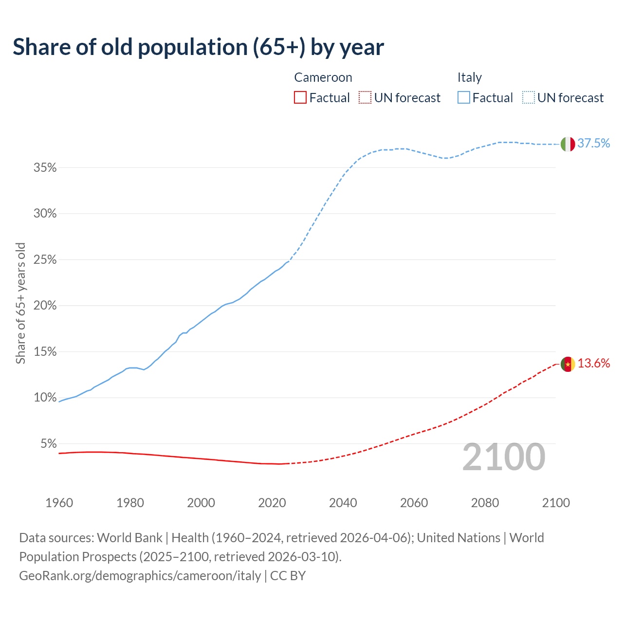 The share of older people aged 65 and over is 2.79% in Cameroon and 24.6% in Italy. Life expectancy in Cameroon compared to Italy .