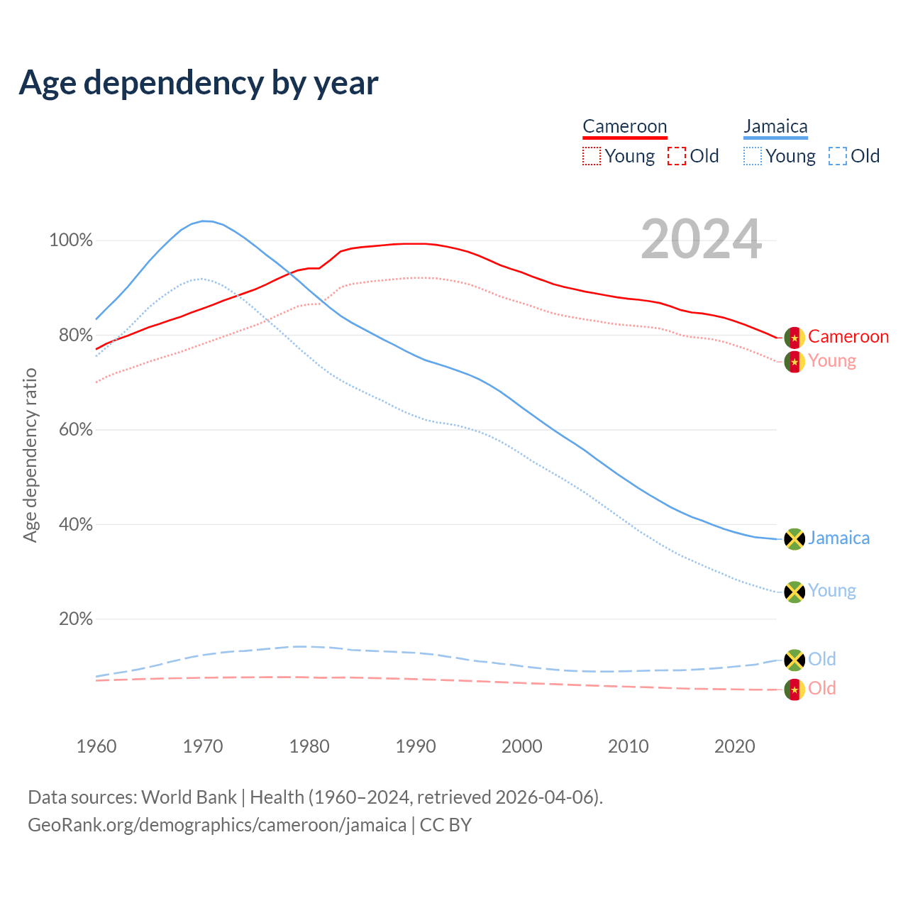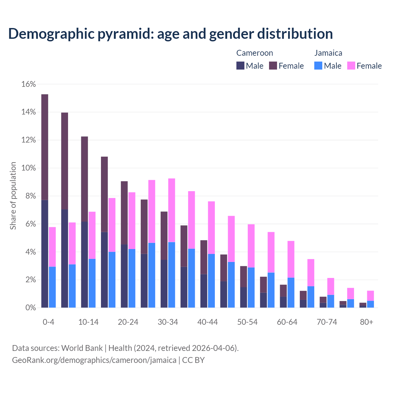 - The share of old-age demographic (65+) in Cameroon is 2.79% vs 8.21% in Jamaica.