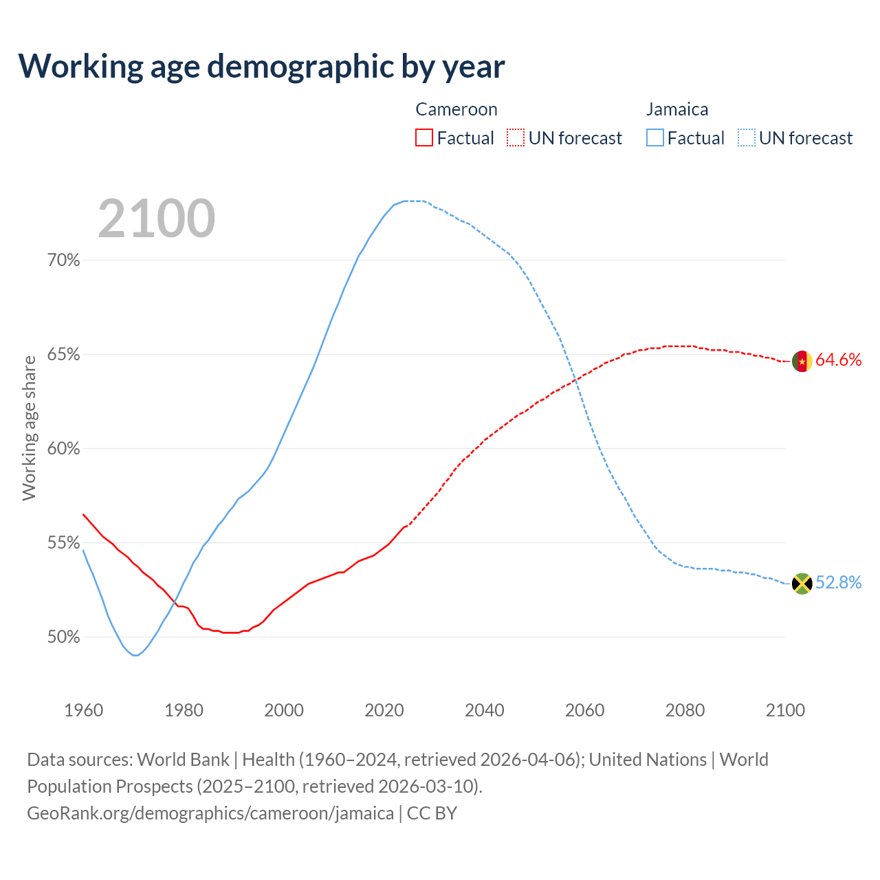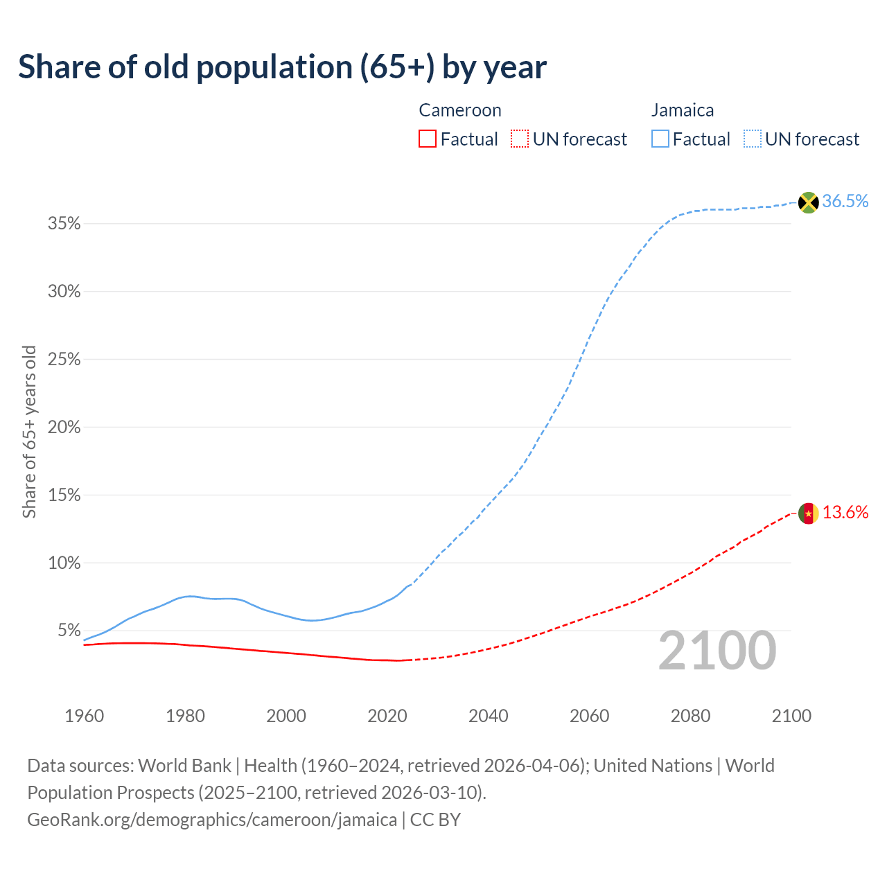 The share of older people aged 65 and over is 2.79% in Cameroon and 8.21% in Jamaica. Life expectancy in Cameroon compared to Jamaica .