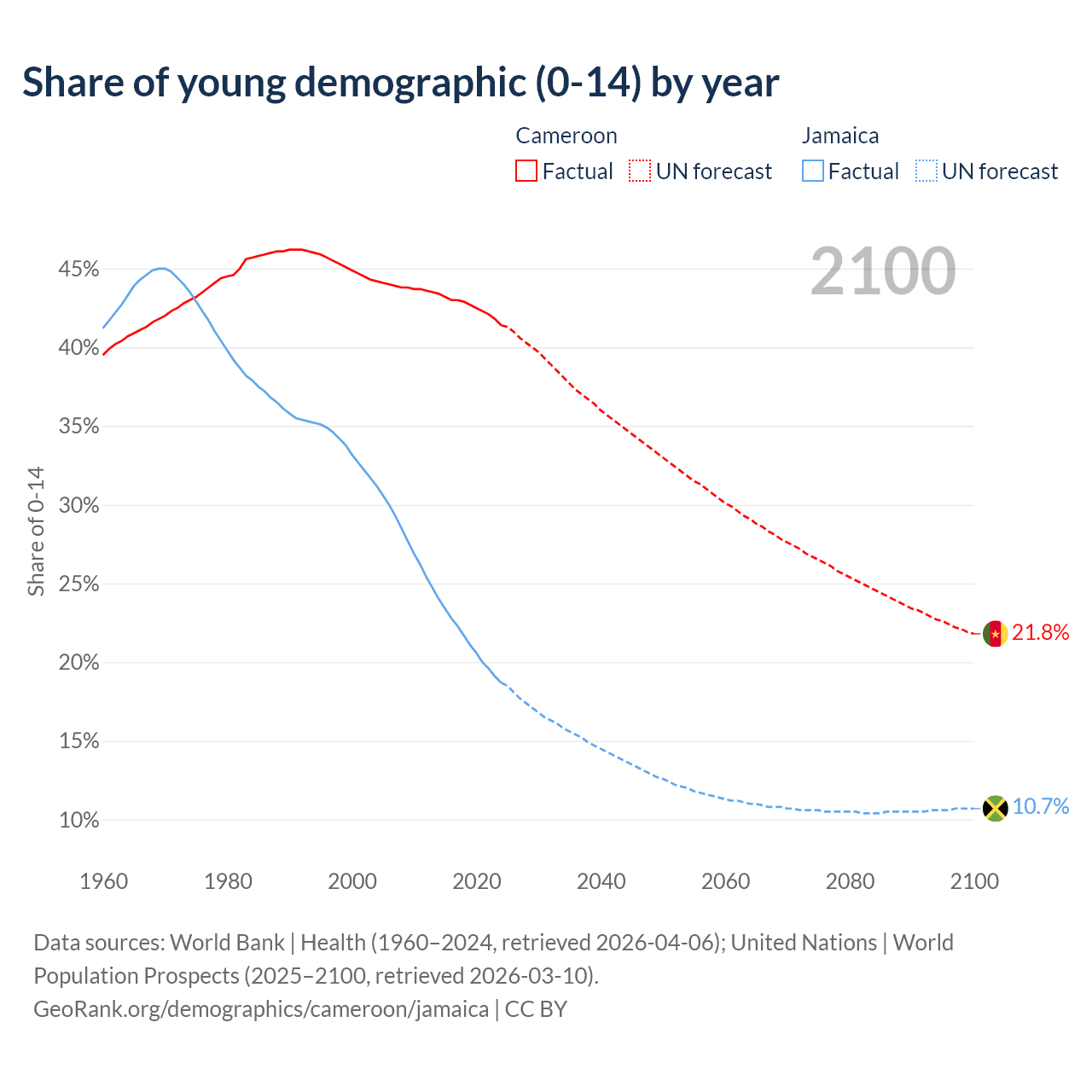 - The share of young demographic (0-15 years old) in Cameroon is 41.4% vs 18.7% in Jamaica.