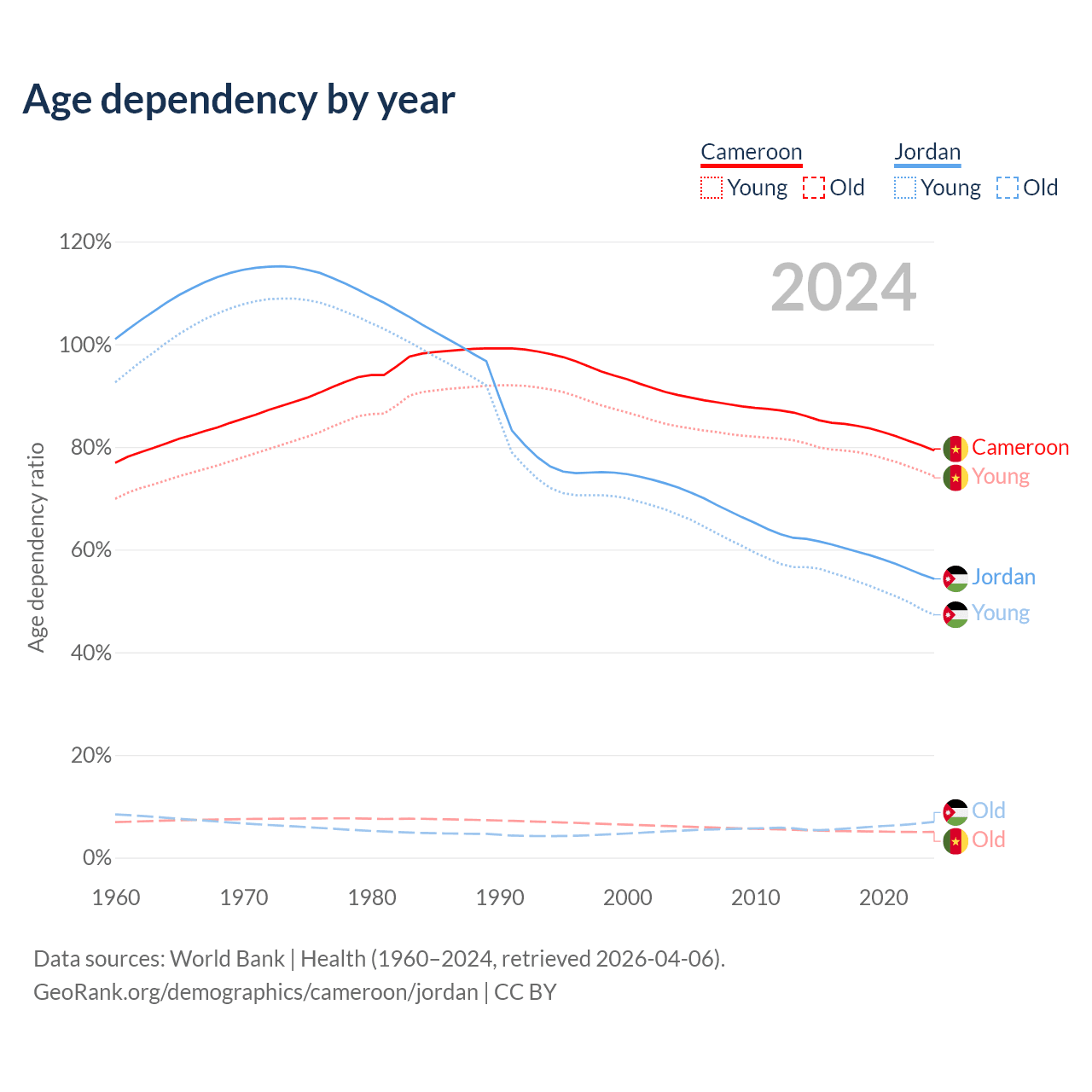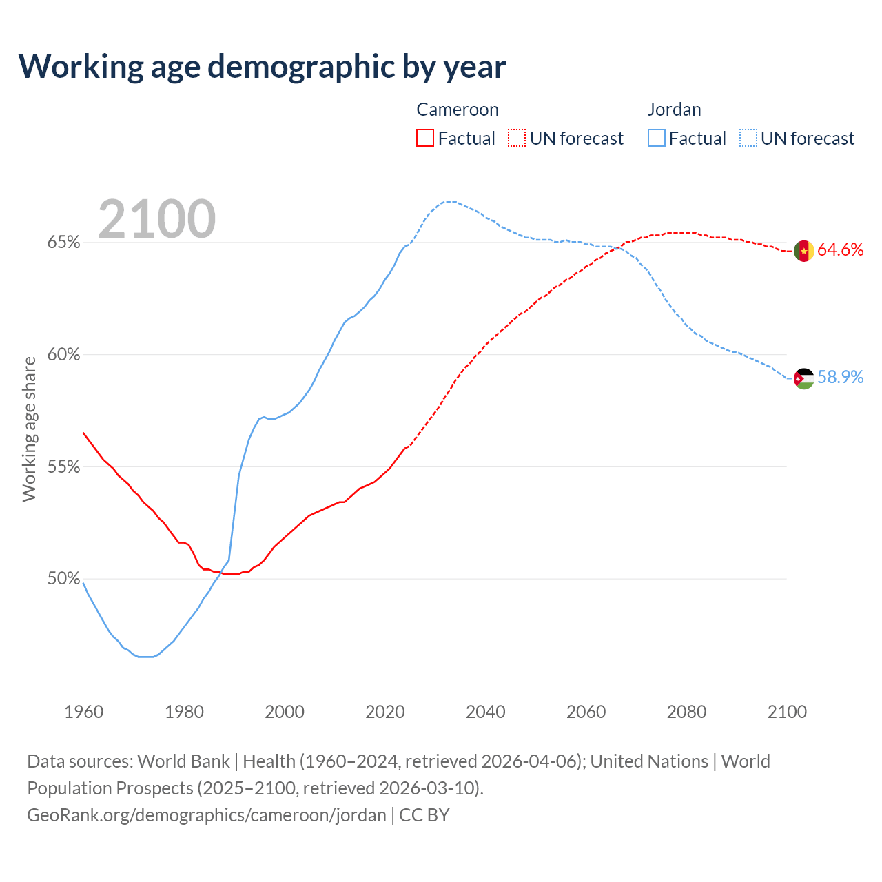 The share of older people aged 65 and over is 2.79% in Cameroon and 4.52% in Jordan. Life expectancy in Cameroon compared to Jordan .