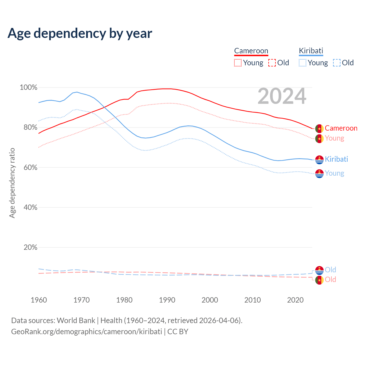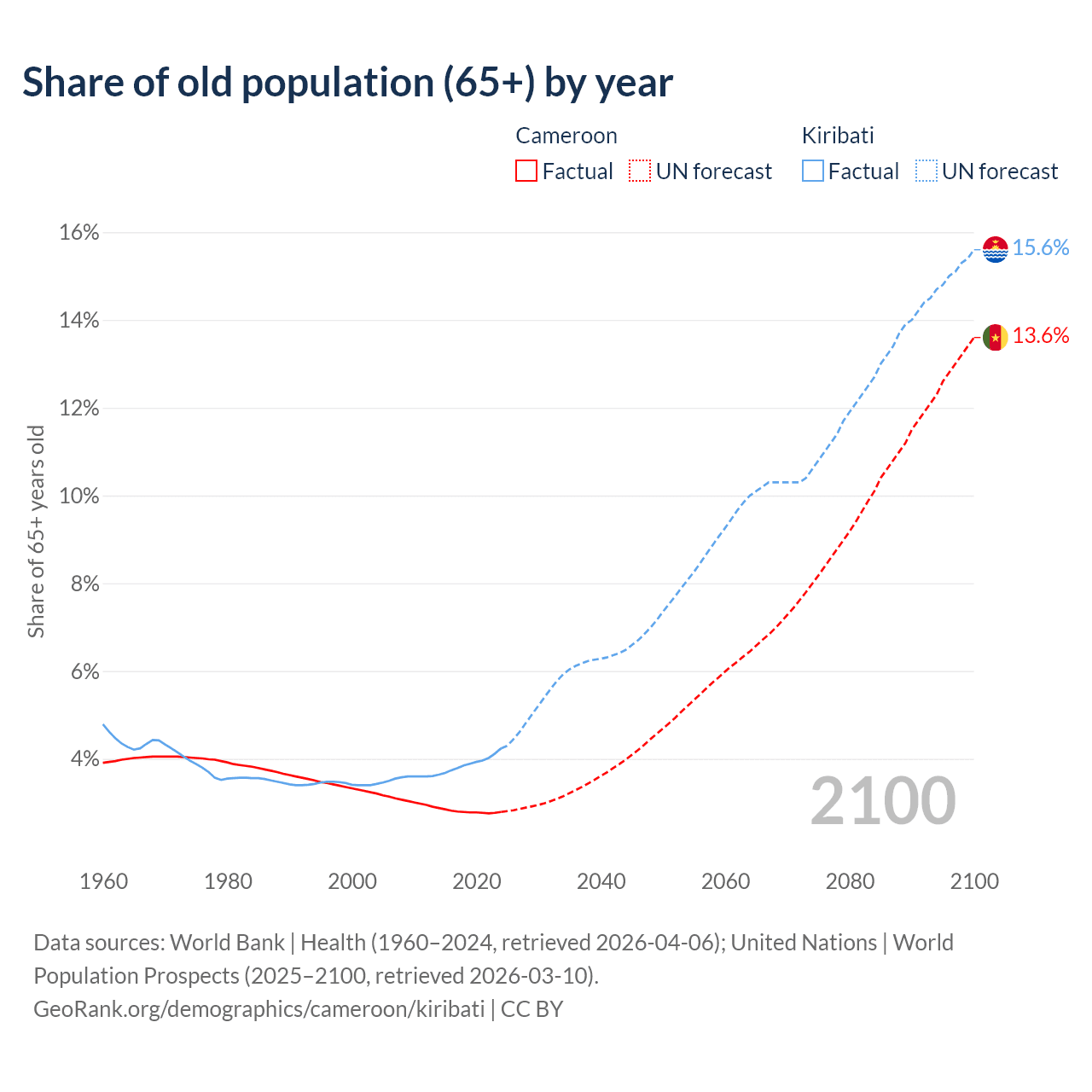 - The share of old-age demographic (65+) in Cameroon is 2.79% vs 4.24% in Kiribati.