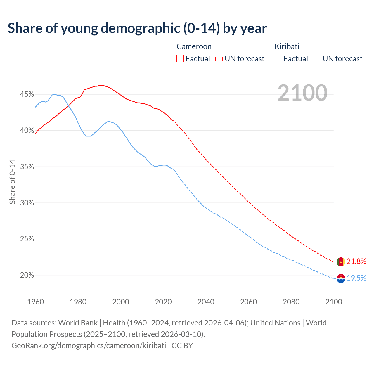- The share of young demographic (0-15 years old) in Cameroon is 41.4% vs 34.7% in Kiribati.