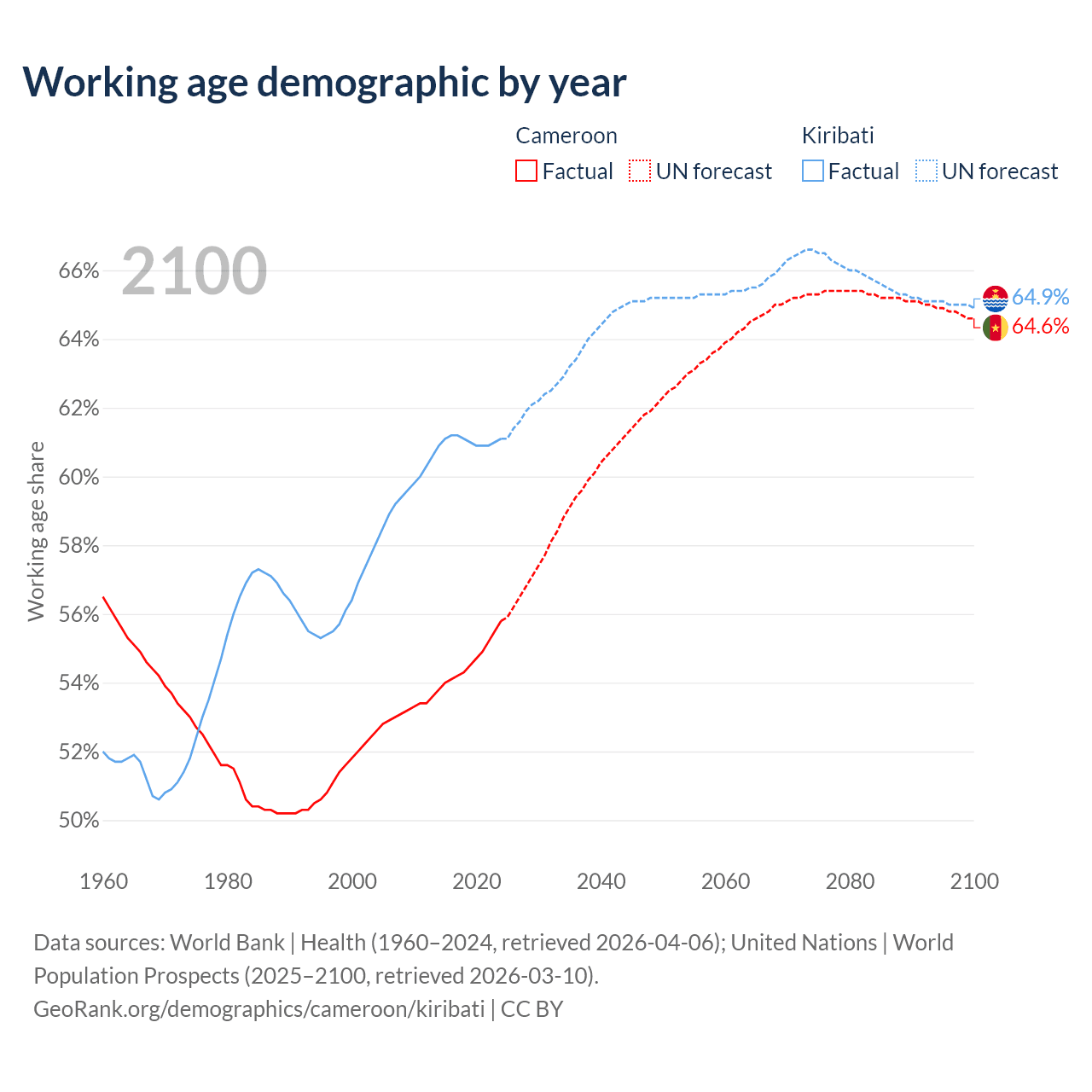 - Cameroon has 17.2M working age adults (aged 15-64) vs 84.9K in Kiribati.