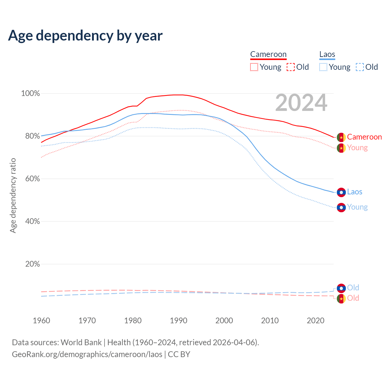 Data sources: World Bank | Health (1960–2024, retrieved 2026-04-06); U.S. Census Bureau (1960–2024, retrieved 2026-02-08).