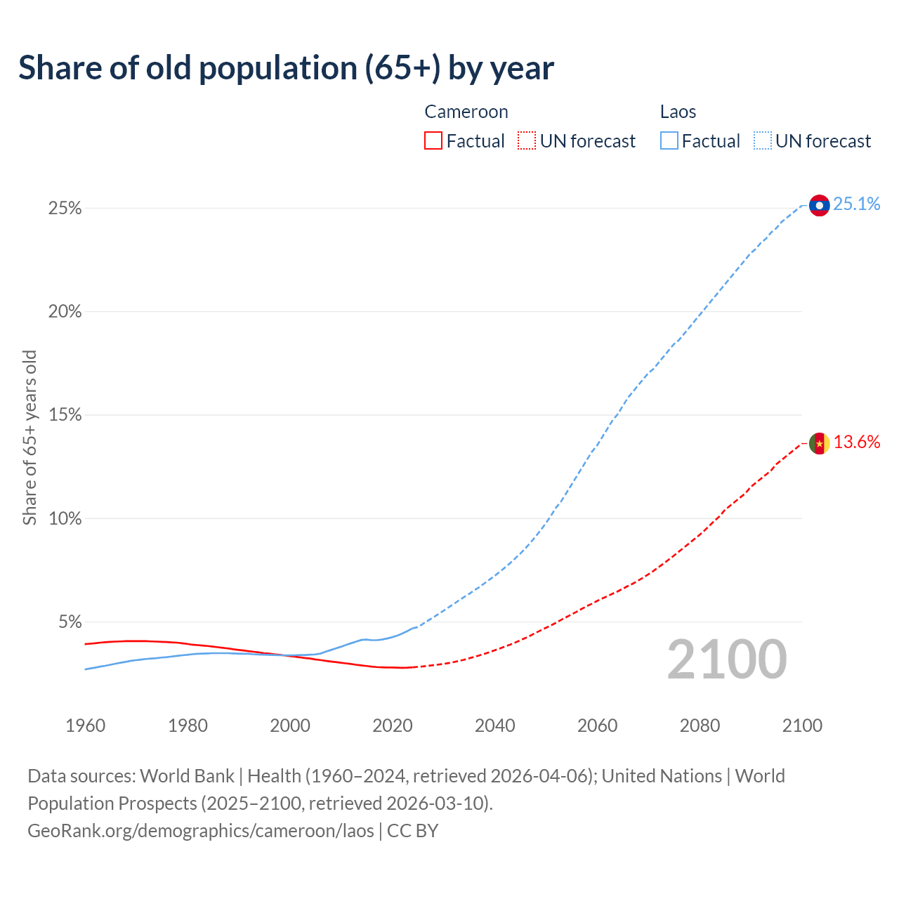 The share of older people aged 65 and over is 2.79% in Cameroon and 4.67% in Laos. Life expectancy in Cameroon compared to Laos .