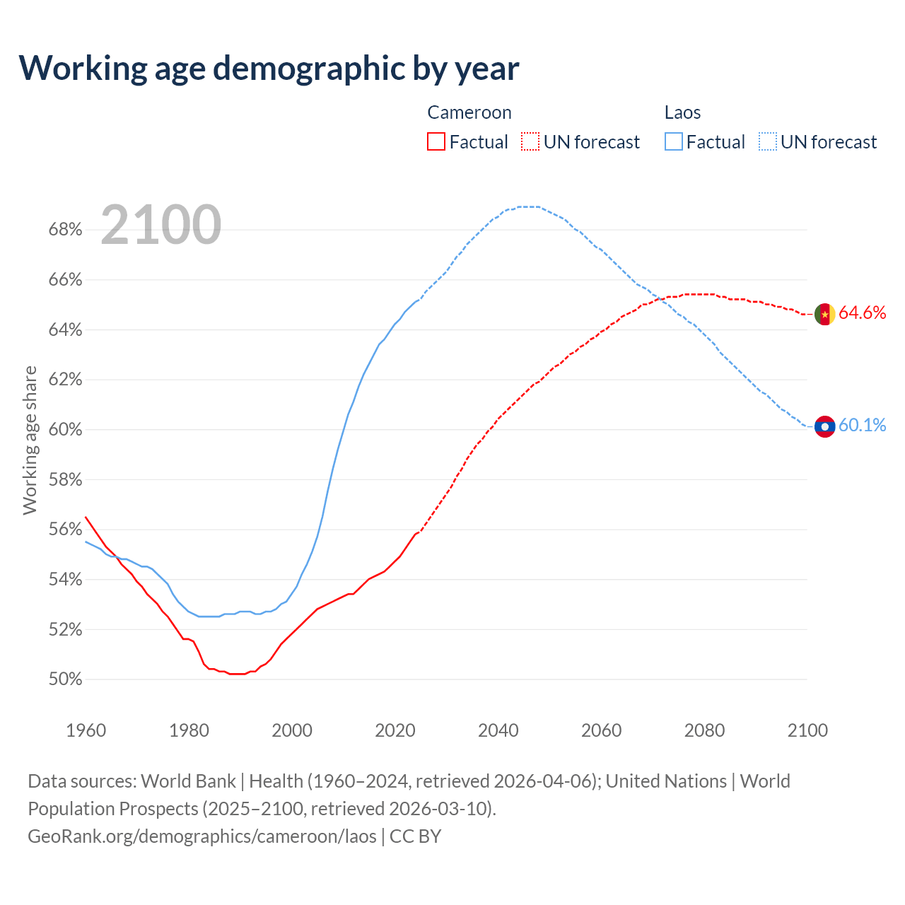 Median age Cameroon vs Laos, 1960-2100