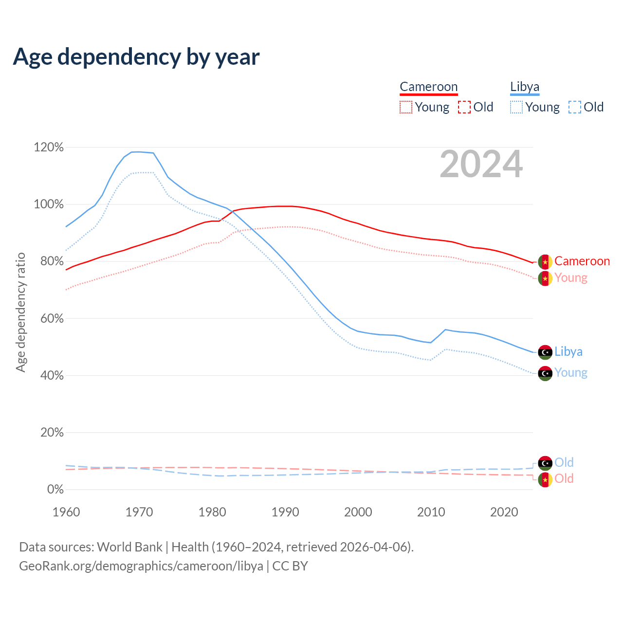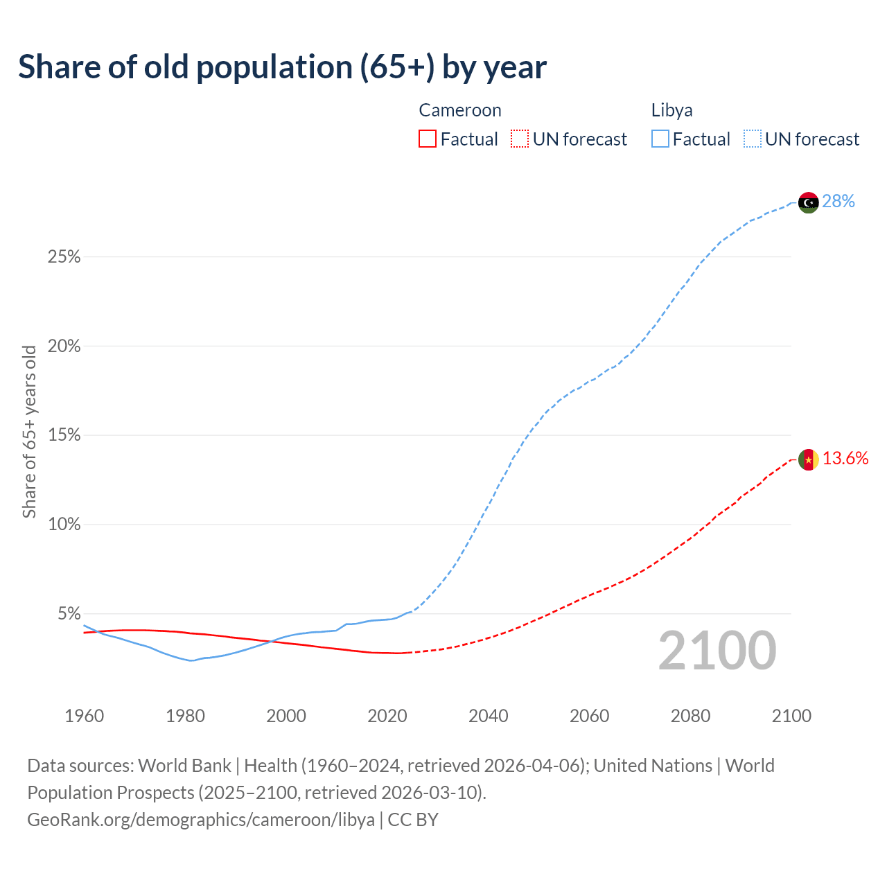 The share of older people aged 65 and over is 2.79% in Cameroon and 5.02% in Libya. Life expectancy in Cameroon compared to Libya .
