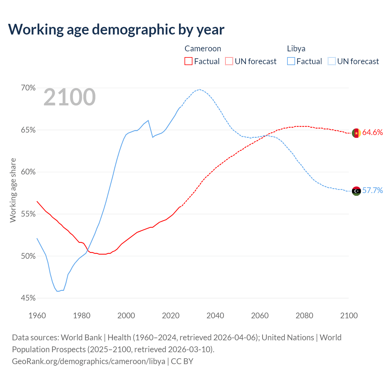 - Cameroon has 17.2M working age adults (aged 15-64) vs 5.11M in Libya.